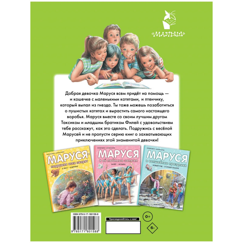 Серия «Приключения Маруси» – это уникальный издательский проект, который стал бестселлером сначала во Франции, а потом и в более чем 50 странах мира! Про весёлую Марусю снимают мультфильмы, которые с успехом идут в России и других странах мира. В книгу «Маруся спешит на помощь. Кошечка. Воробей» вошли две истории об этой доброй девочке. На русский язык книгу пересказала Н. Мавлевич. Для младшего школьного возраста.