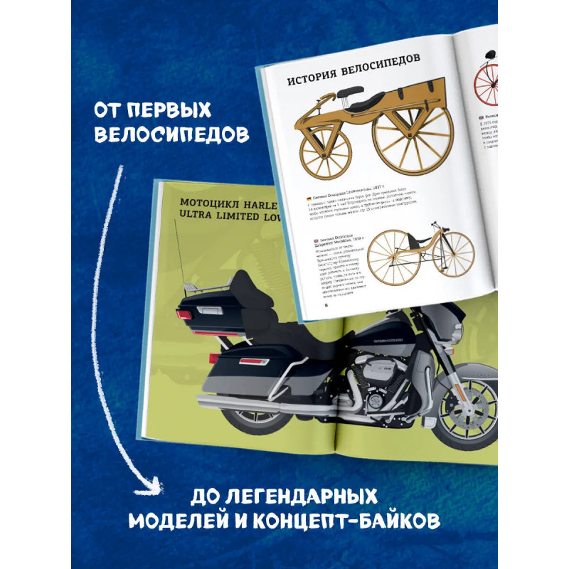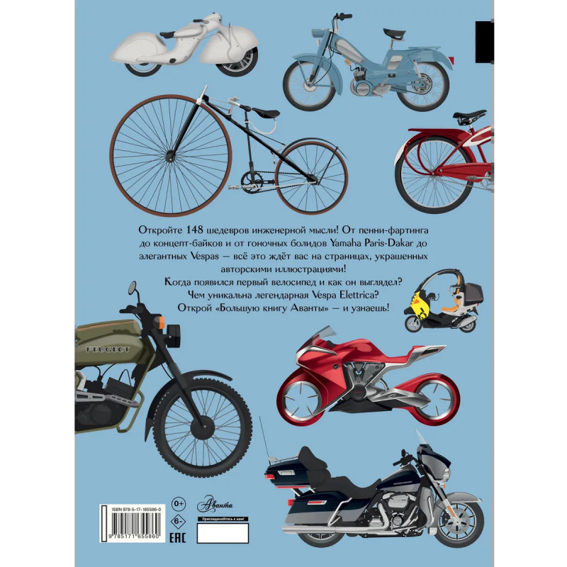 Откройте 148 шедевров инженерной мысли! От пенни-фартинга до концепт-байков и от гоночных болидов Yamaha Paris-Dakar до элегантных Vespas — всё это ждёт вас на страницах, украшенных авторскими иллюстрациями! Когда появился первый велосипед и как он выглядел? Чем уникальна легендарная Vespa Elettrica? Открой "Большую книгу Аванты" — и узнаешь!