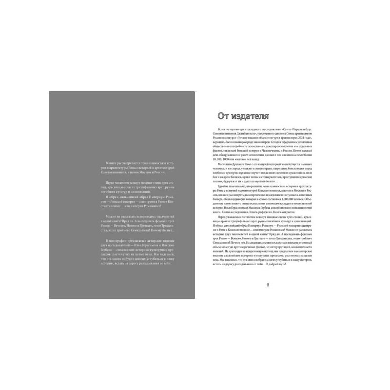 В книге рассматривается тема взаимосвязи истории и архитектуры Рима с историей и архитектурой Константинополя, а потом Москвы и России. Перед читателем встанут мощные стены трех столиц, красавицы-арки их триумфальных врат, руины погибших культур и цивилизаций. И образ, сильнейший образ Империум Романум — Римской империи — с центрами в Риме и Константинополе… или империи Романовых?