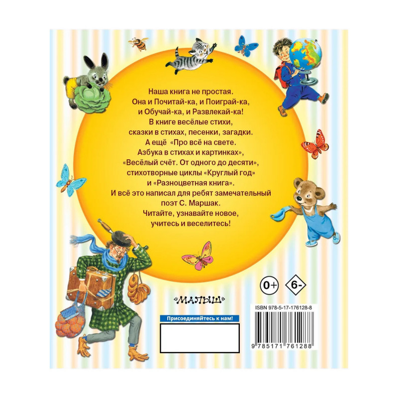 Наша книга не простая. Она и Почитай-ка, и Поиграй-ка, и Обучай-ка, и Развлекай-ка! В книге весёлые стихи, сказки в стихах, песенки, загадки. А ещё «Про всё на свете. Азбука в стихах и картинках», «Весёлый счёт. От одного до десяти», стихотворные циклы «Круглый год» и «Разноцветная книга». И всё это написал для ребят замечательный поэт С. Маршак. Читайте, узнавайте новое, учитесь и веселитесь!
