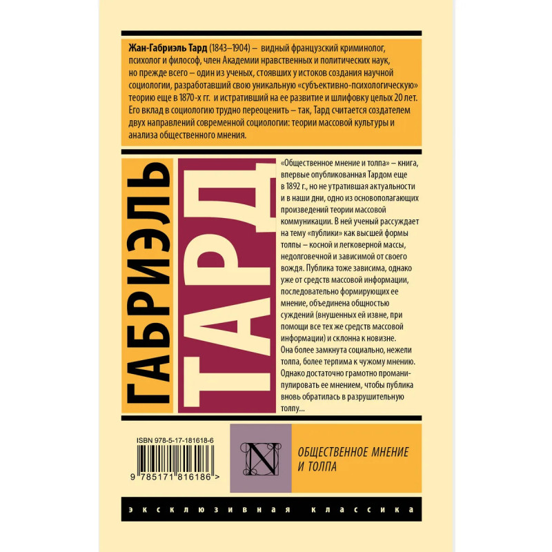 Жан-Габриэль Тард (1843 — 1904) — видный французский криминолог, психолог и философ, член Академии нравственных и политических наук, но прежде всего — один из ученых, стоявших у истоков создания научной социологии, разработавший свою уникальную "субъективно-психологическую" теорию еще в 1870-х гг. и истративший на ее развитие и шлифовку целых 20 лет. Его вклад в социологию трудно переоценить — так, Тард считается создателем двух направлений современной социологии: теории массовой культуры и анализа общественного мнения. "Общественное мнение и толпа" — книга, впервые опубликованная Тардом еще в 1892 г., но не утратившая актуальности и в наши дни, одно из основополагающих произведений теории массовой коммуникации. В ней ученый рассуждает на тему "публики" как высшей формы толпы — косной и легковерной массы, недолговечной и зависимой от своего вождя.