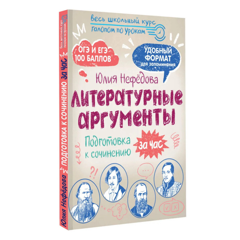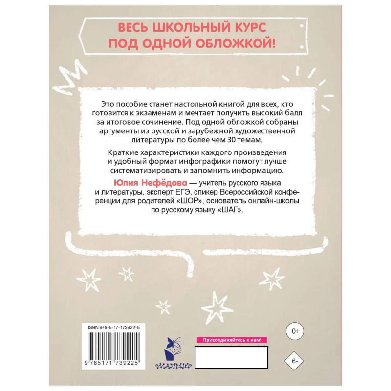 Это пособие поможет систематизировать знания по школьному курсу литературы и быстро подготовиться к сочинению. В книге собраны аргументы из русской и зарубежной литературы по более чем 30-ти темам. Краткие характеристики каждого произведения, цитаты и дополнительные факты помогут лучше систематизировать и запомнить информацию. Приложение с перечнем типовых ошибок ЕГЭ, тренажер по орфографии и пунктуации, словари литературных терминов и сложных слов обеспечат комплексную подготовку к ОГЭ и ЕГЭ по литературе и русскому языку. Автор книги Юлия Нефёдова — учитель русского языка и литературы, эксперт ЕГЭ, спикер Всероссийской конференции для родителей «ШОР» — поможет сдать экзамены на высший балл! Лучшая шпаргалка для для учеников 9, 10 и 11 классов.