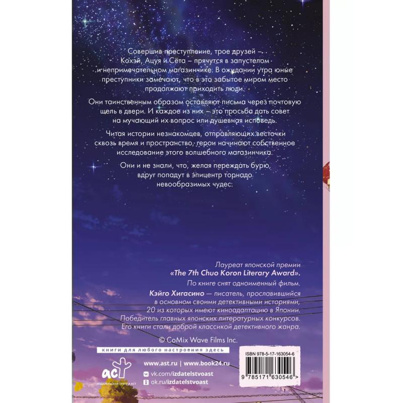 Новинка в серии Хиты Японии. Аниме. Бестселлер, который был удостоен премии Chuo Koron. Кэйго Хигасино - лауреат и номинант многих престижных литературных премий как в Японии, так и за рубежом. Его книги часто попадают в топы и подборки, где занимают верхние строчки. Три юных преступника искали укрытия в заброшенном магазинчике. Как же они удивились, когда обнаружили, что в магазин продолжают приходить письма от посетителей! В посланиях люди рассказывают свои душещипательные истории, делятся жизненными трудностями и просят совета. Что же это за место такое? В попытках найти ответы на интригующие вопросы, негодяи сами не заметили, в какой водоворот чудес их увлекло. Наверное, сама судьба решила перевоспитать юношей и изменить их взгляд на мир.
