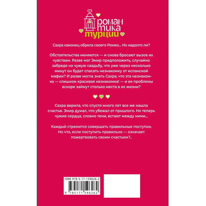 Сахра наконец обрела своего Ромео… Но надол- го ли? Обстоятельства меняются — и снова бросают вызов их чувствам. Разве мог Эмир предположить, случайно забредя на чужую свадьбу, что уже через несколько минут он будет спасать незнакомку от испанской мафии? И разве могла знать Сахра, что эта незнакомка — слишком красивая незнакомка! — и ее проблемы вскоре займут столько места в их жизни? Сахра верила, что спустя много лет все же нашла счастье. Эмир думал, что убежал от прошлого. Но теперь чужие сердца, словно тени, встают между ними... Каждый стремится совершать правильные поступки. Но что, если поступить правильно — означает пожертвовать своим счастьем?..