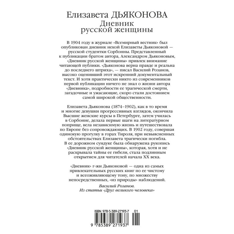 В 1904 году в журнале «Всемирный вестник» был опубликован дневник некой Елизаветы Дьяконовой — русской студентки Сорбонны. Представленный к публикации братом автора, Александром Дьяконовым, «Дневник русской женщины» привлек внимание читающей публики. «Дьяконова верна правде и реальна до последнего штриха», — писал Василий Розанов, высоко оценивший этот искренний документальный текст. И хотя практически никто из современников первой публикации ничего не знал о жизни автора «Дневника», подробности ее трагической смерти, загадочные и ужасающие, скоро стали достоянием самой широкой общественности. Елизавета Дьяконова (1874–1902), как в то время и многие девушки прогрессивных взглядов, окончила Высшие женские курсы в Петербурге, затем училась в Сорбонне, делала первые шаги на литературном поприще, вела независимую жизнь и путешествовала по Европе без сопровождающих.