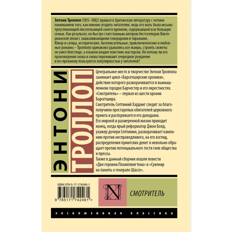 — Классика викторианской литературы. — «Смотритель» — первая книга цикла «Барсетширские хроники». Все романы цикла обладают самостоятельными сюжетами, их можно читать по отдельности. — В данное издание также вошли повести «Две героини Пламплингтона» и «Сувенир на память о генерале Шассе». — Энтони Троллоп — один из самых успешных, талантливых и плодотворных писателей второй половины XIX века. — Издание в серии «Эксклюзивная классика» — в удобном карманном формате и узнаваемом оформлении.