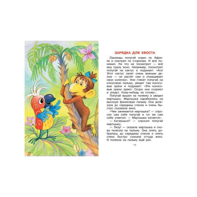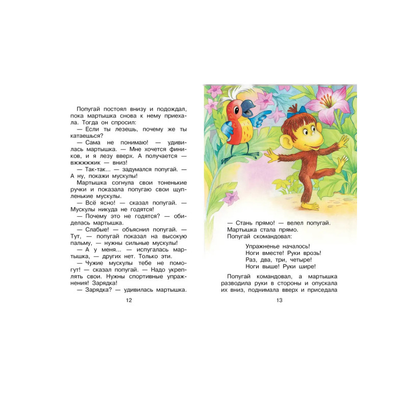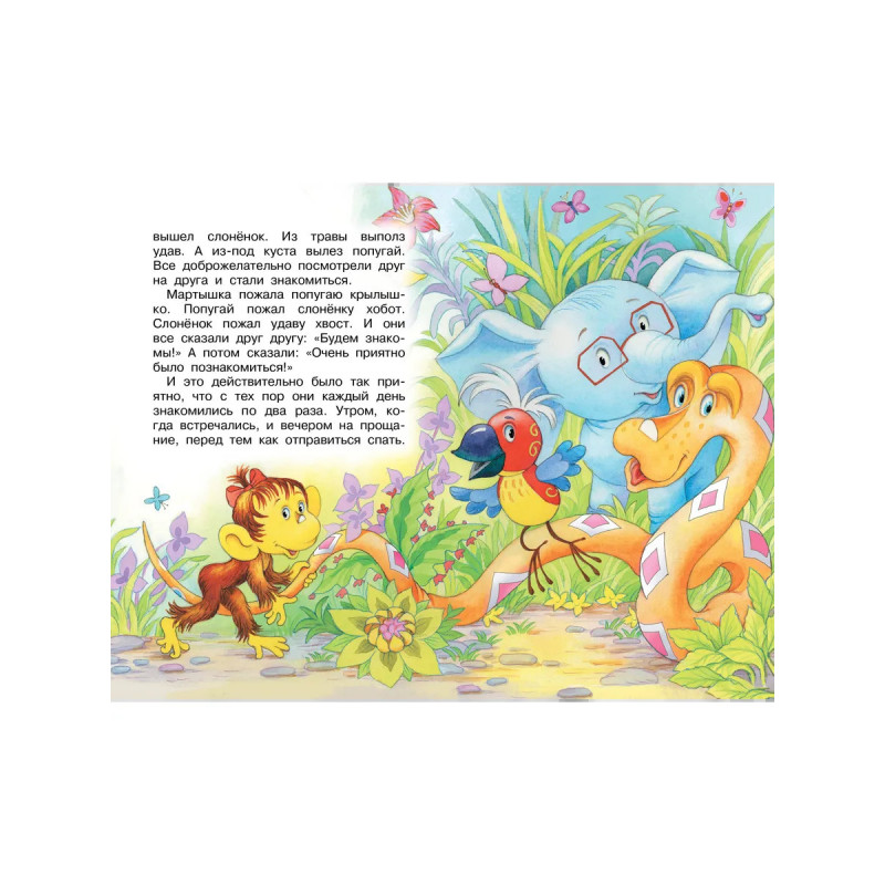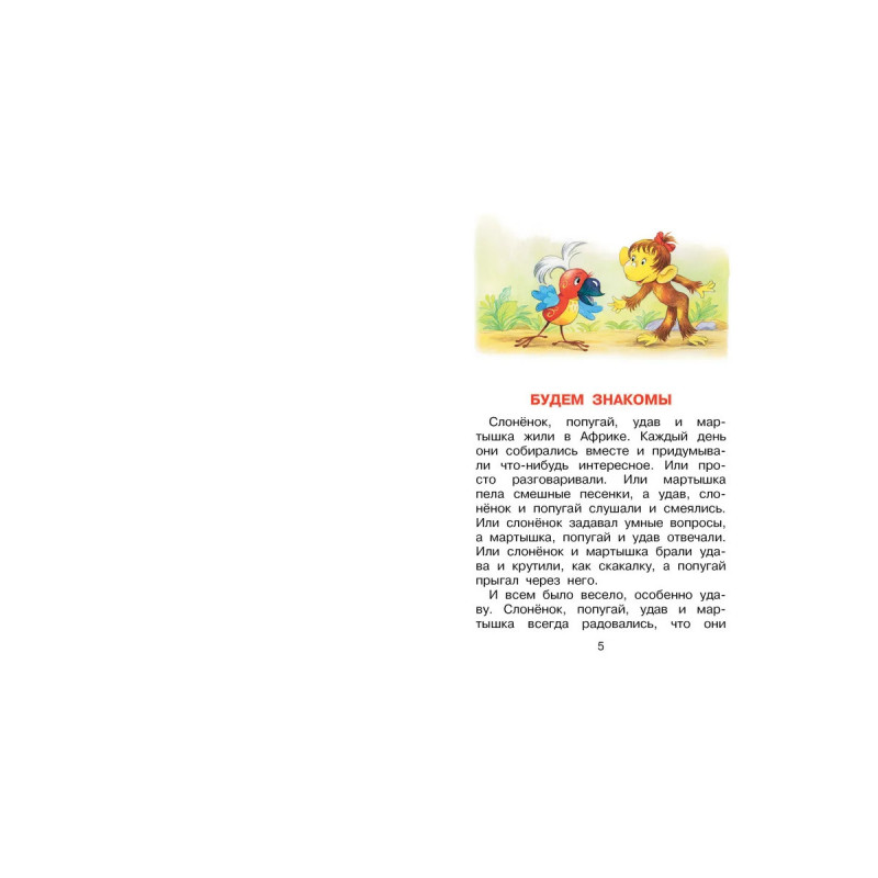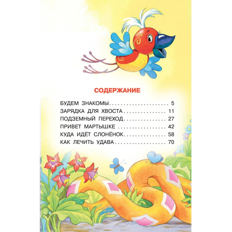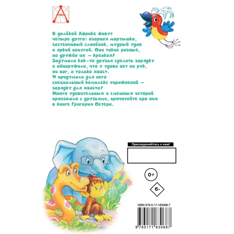 В далёкой Африке живут четыре друга: озорная мартышка, застенчивый слонёнок, мудрый удав и яркий попугай. Они такие разные, но дружба их — крепкая! Задумали как-то друзья сделать зарядку и обнаружили, что у удава нет ни рук, ни ног, а только хвост. И придумали для него специальный комплекс упражнений — зарядку для хвоста! Много удивительных и смешных историй произошло с друзьями, прочитайте про них в книге Григория Остера.