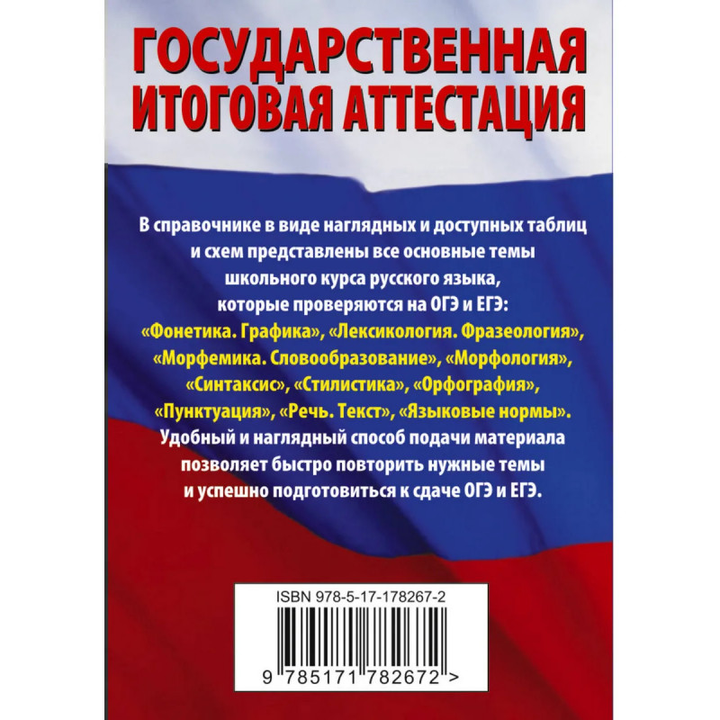 В справочнике в виде наглядных и доступных таблиц и схем представлены все основные темы школьного курса русского языка, которые проверяются на ЕГЭ и ОГЭ: "Фонетика. Графика", "Лексикология. Фразеология", "Морфемика. Словообразование", "Морфология", "Синтаксис", "Стилистика", "Орфография", "Пунктуация", "Речь. Текст", "Языковые нормы". Удобный и наглядный способ подачи материала позволяет быстро повторить нужные темы и успешно подготовиться к сдаче ЕГЭ и ОГЭ.