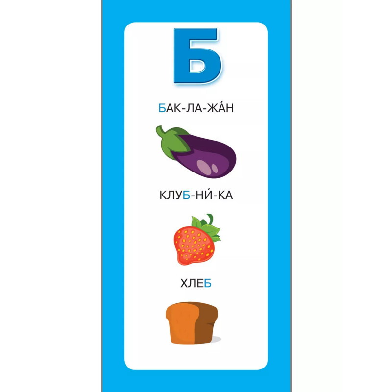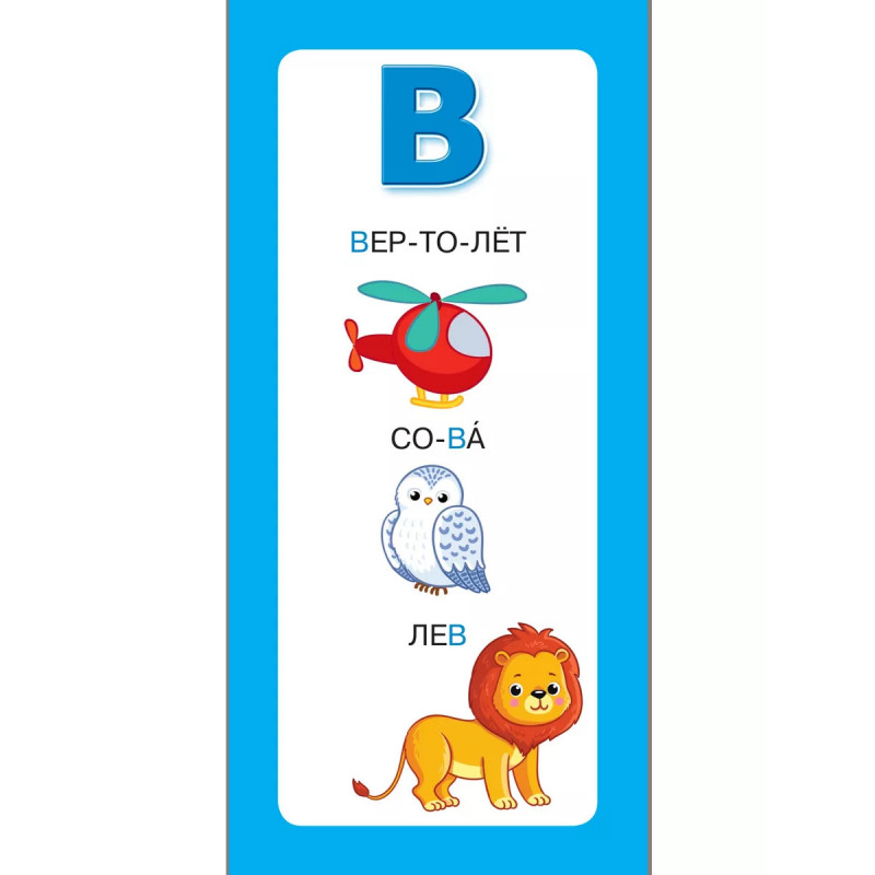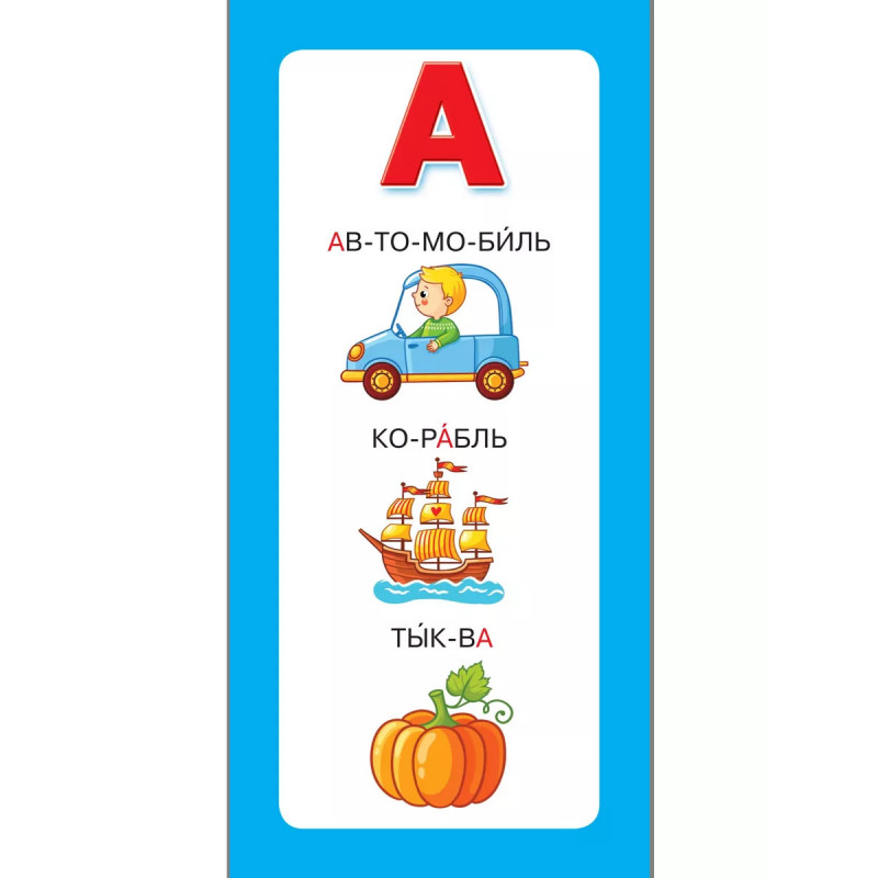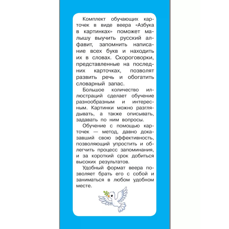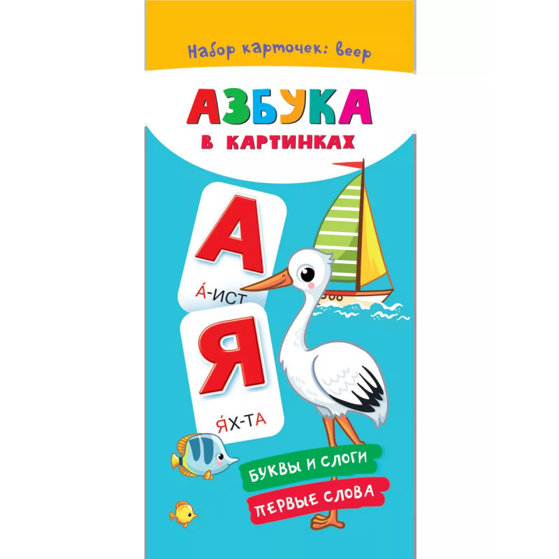 С чего начать обучение малыша? таким вопросом задаются многие заботливые родители. На помощь им приходят карточки Азбука в картинках. Обучающие карточки основной принцип методики, признанной многими поколениями родителей, воспитателей, психологов и врачей-педиатров во всём мире. Комплект с карточками в виде веера позволит малышу изучить азбуку: запомнить написание всех букв и находить их в словах. Скороговорки, представленные на последних карточках идеально для развития речи и обогащения словарного запаса. Лёгкий, удобный, компактный веер можно взять с собой в дорогу как развлечение в пути, с ним можно отправиться в путешествие, а можно играть дома. В комплект входит 48 двухсторонних картонных карточек с закруглёнными краями.