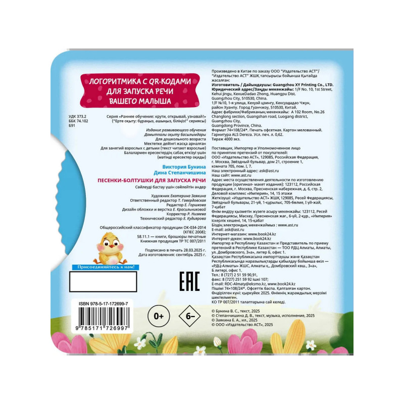 Красочная книга-игра, книга-подарок с окошками, колёсиками из плотного картона и простыми песенками по QR-кодам для запуска речи детей 1-3 лет — настоящая находка для заботливых родителей! Задания на выбор угощение для домашних животных, на поиски спрятавшихся малышей, а также логоритмические упражнения способствуют развитию речи, мышления, мелкой моторики рук, глазодвигательной координации, памяти и внимания. В процессе увлекательной игры с книгой, ребенок сможет сказать первые слова. Книга разработана на основе методики запуска речи опытного логопеда, нейрореабилитолога Виктории Буниной и талантилвого музыкального педагога, логопеда Дины Степенчишиной. Для детей до 3 лет.