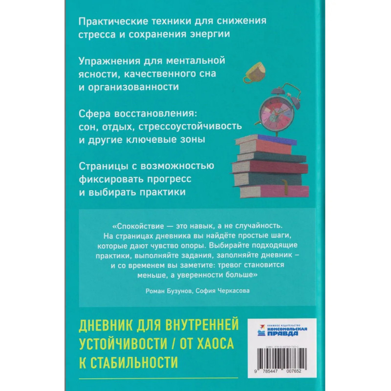 Планер с антистресс-техниками для внутренней опоры от практикующих сомнологов Романа Бузунова и Софии Черкасовой, авторов бестселлера «Преднамеренное спокойствие». Его страницы станут поддержкой людей, живущих в режиме постоянной загрузки. Внутри вы найдёте подробную инструкцию по заполнению, методику, помогающую определить дефициты устойчивости, авторские техники и трекеры для регулярной оценки психоэмоционального состояния. Восстанавливайтесь по восьми ключевым направлениям – от сна и отдыха до отношений и мотивации. Внедряйте полезные практики, не требующие много времени, и добивайтесь стойких позитивных изменений.