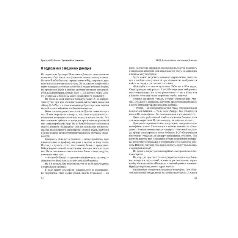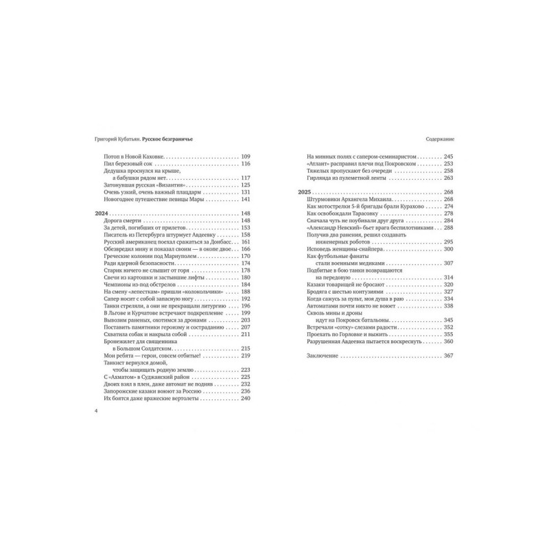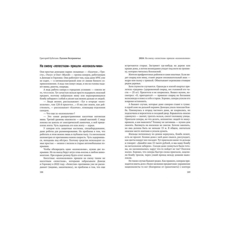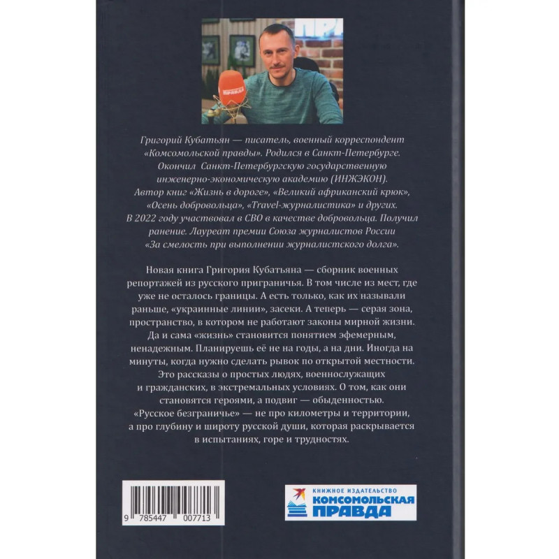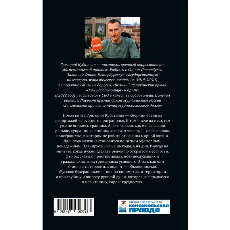 Новая книга Григория Кубатьяна — сборник военных репортажей из русского приграничья. В том числе из мест, где уже не осталось границы. А есть только, как их называли раньше, «украинные линии», засеки. А теперь — серая зона, пространство, в котором не работают законы мирной жизни. Да и сама «жизнь» становится понятием эфемерным, ненадежным. Планируешь её не на годы, а на дни. Иногда на минуты, когда нужно сделать рывок по открытой местности. Это рассказы о простых людях, военнослужащих и гражданских, в экстремальных условиях. О том, как они становятся героями, а подвиг — обыденностью. «Русское безграничье» — не про километры и территории, а про глубину и широту русской души, которая раскрывается в испытаниях, горе и трудностях.