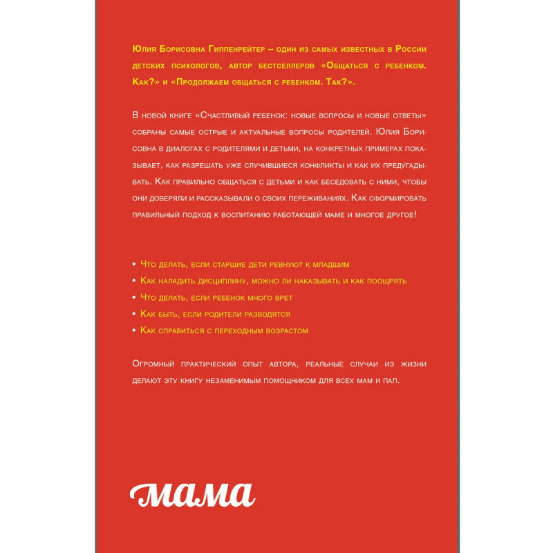 Юлия Борисовна Гиппенрейтер – один из самых известных в России детских психологов, автор бестселлеров "Общаться с ребенком. Как?" и "Продолжаем общаться с ребенком. Так?" В книге "Счастливый ребенок: новая книга вопросов и ответов" собраны самые острые и актуальные вопросы родителей. Юлия Борисовна в диалогах с родителями и детьми, на конкретных примерах показывает, как разрешать уже случившиеся конфликты и как их предугадывать. Как правильно общаться с детьми, и как беседовать с ними, чтобы они доверяли и рассказывали о своих переживаниях. Как сформировать правильный подход к воспитанию работающей маме, и многое другое! • Что делать, если старшие дети ревнуют к младшим • Как выстроить дисциплину, можно ли наказывать и как поощрять • Что делать, если ребенок много врет • Как быть, если родители разводятся • Как справится с переходным возрастом Огромный практический опыт автора, реальные случаи из жизни делают эту книгу незаменимым помощником для всех мам и пап.