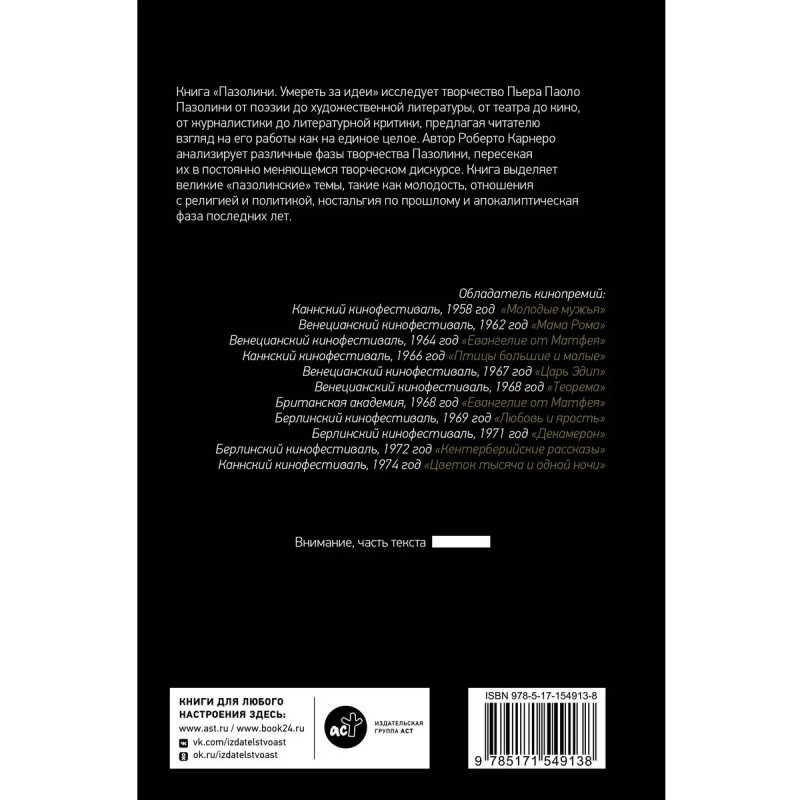 Книга Пазолини. Умереть за идеи исследует творчество Пьера Паоло Пазолини от поэзии до художественной литературы, от театра до кино, от журналистики до литературной критики, предлагая читателю взгляд на его работы как на единое целое. Автор Роберто Карнеро анализирует различные фазы творчества Пазолини, пересекая их в постоянно меняющемся творческом дискурсе. Книга выделяет великие пазолинские темы, такие как молодость, отношения с религией и политикой, ностальгия по прошлому и апокалиптическая фаза последних лет.