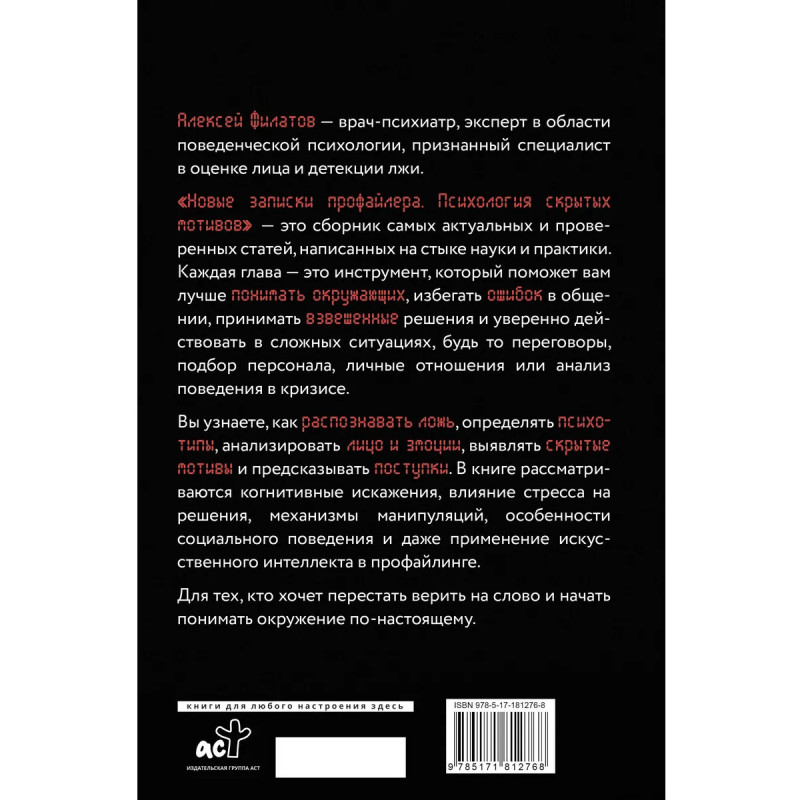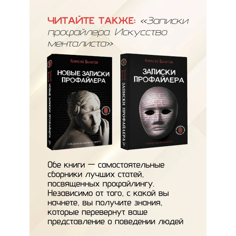 Алексей Филатов — эксперт-профайлер международного уровня. Директор лаборатории цифрового профайлинга, Сколково. Автор и создатель методик профайлинга, систем комплексной психодиагностики и верификации лжи. Практический опыт профайлинга — более десяти лет. Образование: высшее медицинское (психиатрия) и психологическое. Изучал нейролингвистику, когнитивистику, поведенческий и криминалистический анализ. Проходил специальное обучение у мировых мэтров профайлинга в Великобритании, Швейцарии, Португалии, Франции, США. "Новые записки профайлера. Психология скрытых мотивов" — это сборник самых актуальных и проверенных статей, написанных на стыке науки и практики. Каждая глава — это инструмент, который поможет вам лучше понимать окружающих, избегать ошибок в общении, принимать взвешенные решения и уверенно действовать в сложных ситуациях — будь то переговоры, подбор персонала, личные отношения или анализ поведения в кризисе.