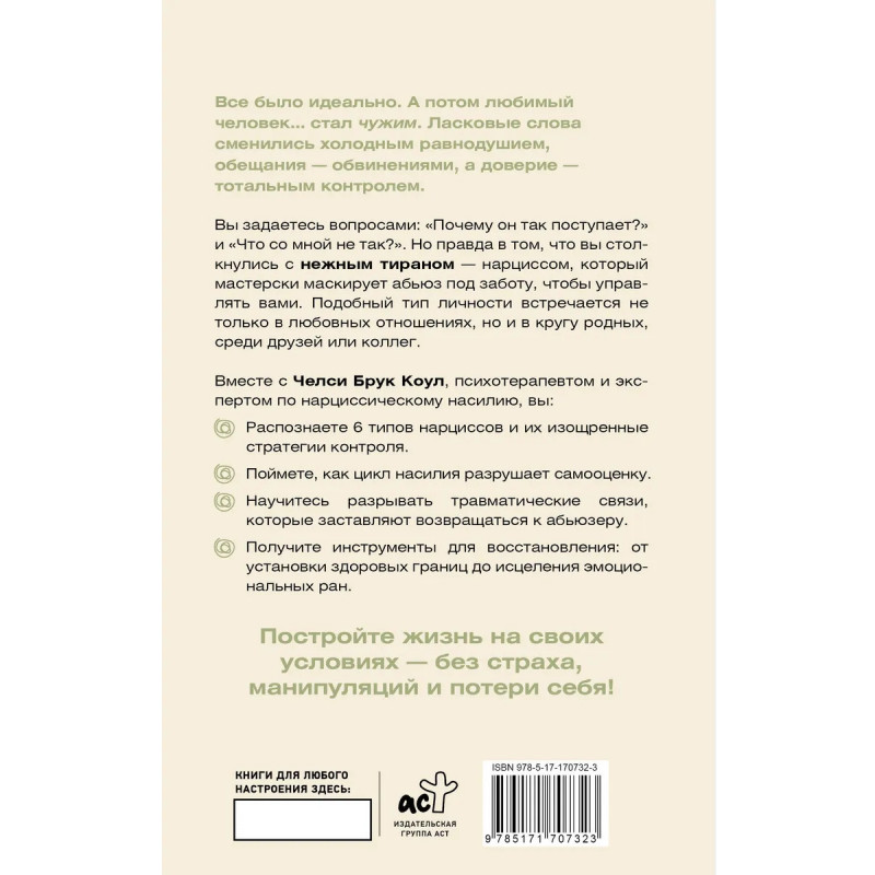 Все было идеально. А потом любимый человек… стал чужим. Ласковые слова сменились холодным равнодушием, обещания — обвинениями, а доверие — тотальным контролем. Вы задаетесь вопросами: "Почему он так поступает?" и "Что со мной не так?". Но правда в том, что вы столкнулись с нежным тираном — нарциссом, который мастерски маскирует абьюз под заботу, чтобы управлять вами. Подобный тип личности встречается не только в любовных отношениях, но и в кругу родных, среди друзей или коллег. Вместе с Челси Брук Коул, психотерапевтом и экспертом по нарциссическому насилию, вы: • Распознаете 6 типов нарциссов и их изощренные стратегии контроля. • Поймете, как цикл насилия разрушает самооценку. • Научитесь разрывать травматические связи, которые заставляют возвращаться к абьюзеру. • Получите инструменты для восстановления: от установки здоровых границ до исцеления эмоциональных ран. Постройте жизнь на своих условиях — без страха, манипуляций и потери себя!