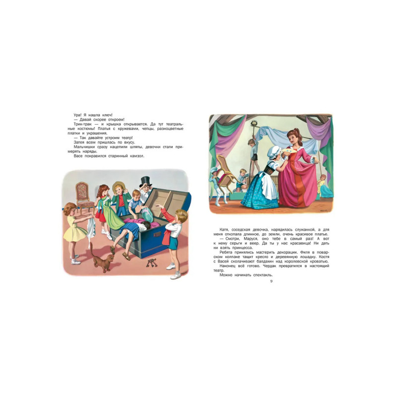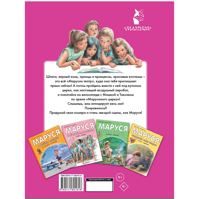 Шпаги, верный конь, принцы и принцессы, красивые костюмы – это всё «Марусин театр», куда она тебя приглашает прямо сейчас! А потом пройдись вместе с ней под куполом цирка, как настоящий воздушный акробат, и покатайся на велосипеде с Мишкой и Таксиком по арене «Марусиного цирка»! Слышишь, вам аплодирует весь зал! Понравилось? Придумай свои номера и стань звездой сцены, как Маруся!
