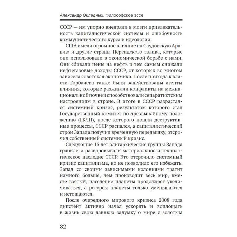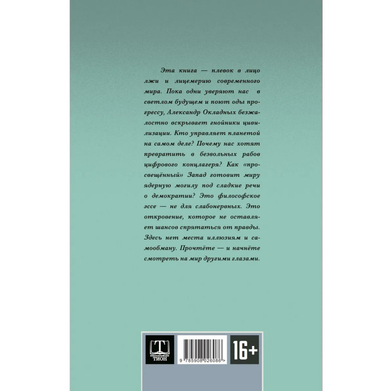 Эта книга плевок в лицо лжи и лицемерию современного мира. Пока одни уверяют нас в светлом будущем и поют оды прогрессу, Александр Окладных безжалостно вскрывает гнойники цивилизации. Кто управляет планетой на самом деле? Почему нас хотят превратить в безвольных рабов цифрового концлагеря? Как просвещённый Запад готовит миру ядерную могилу под сладкие речи о демократии? Это философское эссе не для слабонервных. Это откровение, которое не оставляет шансов спрятаться от правды. Здесь нет места иллюзиям и самообману. Прочтёте и начнёте смотреть на мир другими глазами.