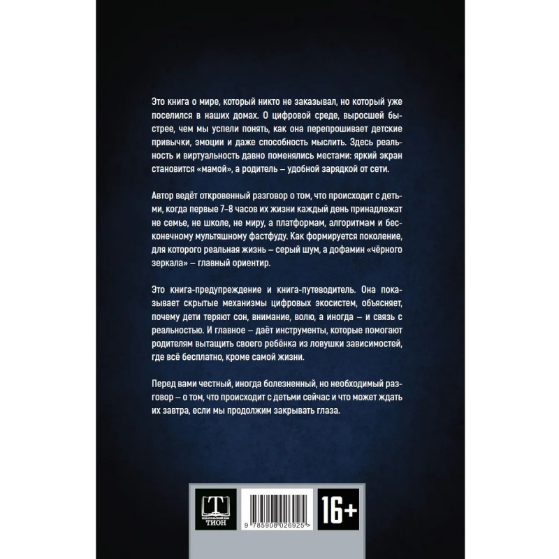Это книга о мире, который никто не заказывал, но который уже поселился в наших домах. О цифровой среде, выросшей быстрее, чем мы успели понять, как она перепрошивает детские привычки, эмоции и даже способность мыслить. Здесь реальность и виртуальность давно поменялись местами: яркий экран становится «мамой», а родитель — удобной зарядкой от сети.