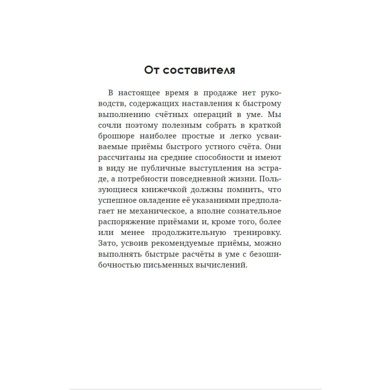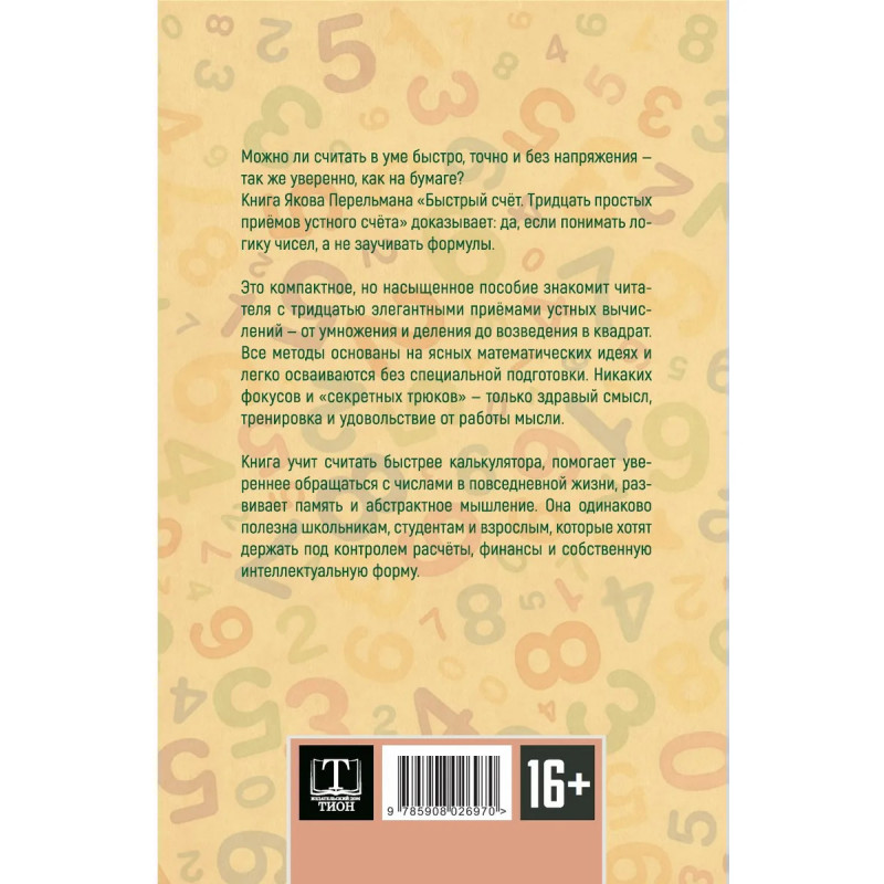 Книга учит считать быстрее калькулятора, помогает увереннее обращаться с числами в повседневной жизни, развивает память и абстрактное мышление. Она одинаково полезна школьникам, студентам и взрослым, которые хотят держать под контролем расчёты, финансы и собственную интеллектуальную форму.