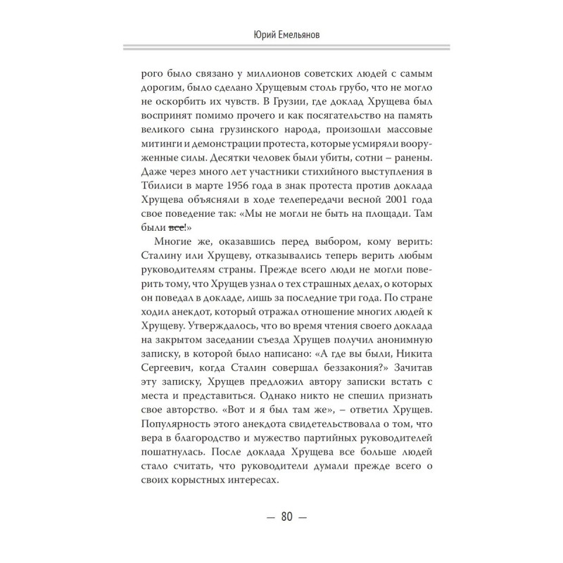 Кем был Никита Хрущёв реформатором, разоблачителем или умелым разрушителем чужого наследия ради собственной власти? Был ли XX съезд КПСС актом нравственного прозрения или тщательно спланированной политической операцией? И кто на самом деле стоял за развенчанием культа личности?В этой книге Юрий Емельянов предлагает взглянуть на эпоху хрущёвской оттепели с непривычного ракурса. Что скрывалось за громкими речами о законности и коллективном руководстве? Почему ответственность за репрессии была возложена на одного человека и кому это было выгодно? Случайны ли совпадения в борьбе Хрущёва с его политическими соперниками или перед нами последовательная стратегия удержания власти?Опираясь на документы, стенограммы и малоизвестные свидетельства, автор ставит под сомнение привычные трактовки XX съезда и задаёт главный вопрос: стало ли разоблачение Сталина шагом к правде или началом нового мифа, определившего судьбу страны на десятилетия вперёд?