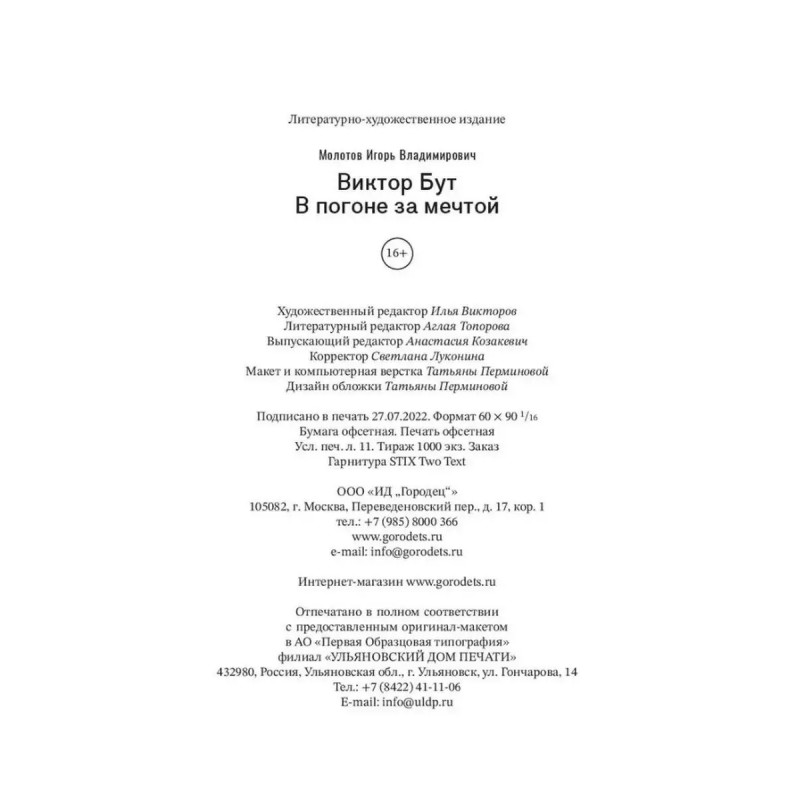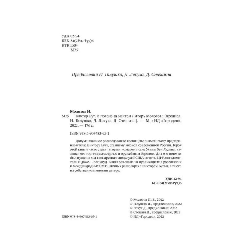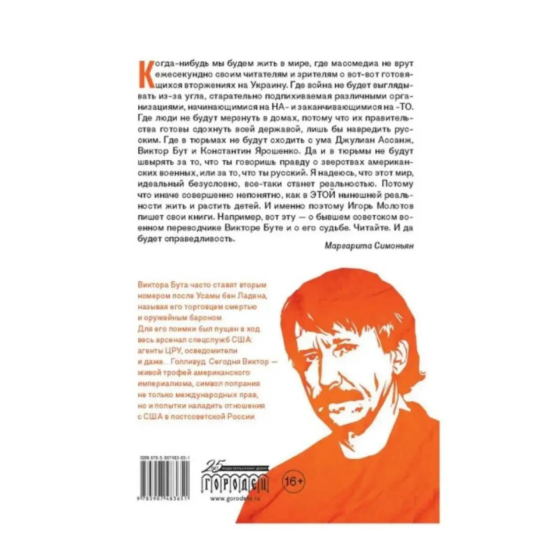 Виктор Бут. В погоне за мечтой. Молотов Игорь. Документальное расследование посвящено знаменитому предпринимателю Виктору Буту, ставшему иконой современной России. Героя этой книги часто ставят вторым номером после Усамы бен Ладена, называя его торговцем смертью и оружейным бароном. Для его поимки был пущен в ход весь арсенал спецслужб США: агенты ЦРУ, осведомители и даже... Голливуд.Книга основана на публикациях в российских и международных СМИ, личных разговорах с Виктором Бутом, а также на собственном мнении автора.