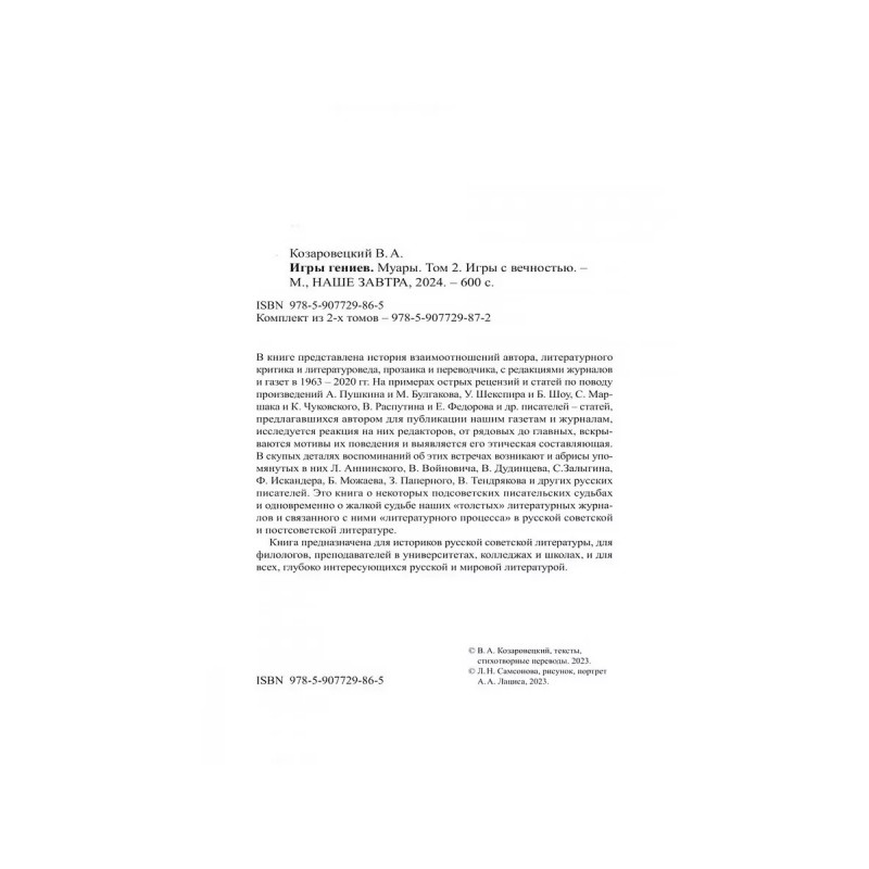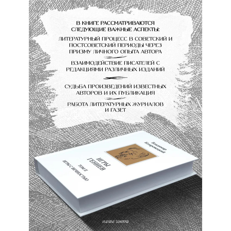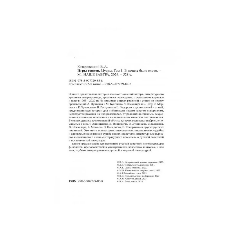 Игры гениев (комплект из 2-х томов). Козаровецкий В.А. В книге представлена история взаимоотношений автора, литературного критика и литературоведа, прозаика и переводчика, с редакциями журналов и газет в 19632020 гг. На примерах острых рецензий и статей по поводу произведений А. Пушкина и М. Булгакова, У. Шекспира и Б. Шоу, С. Маршака и К. Чуковского, В. Распутина и Е. Федорова и др. писателей статей, предлагавшихся автором для публикации нашим газетам и журналам, исследуется реакция на них редакторов, от рядовых до главных, вскрываются мотивы их поведения и выявляется его этическая составляющая.В скупых деталях воспоминаний об этих встречах возникают и абрисы упомянутых в них Л. Аннинского, В. Войновича, В. Дудинцева, С. Залыгина, Ф. Искандера, Б. Можаева, З. Паперного, В. Тендрякова и других русских писателей. Это книга о некоторых подсоветских писательских судьбах и одновременно о жалкой судьбе наших "толстых" литературных журналов и связанного с ними "литературного процесса" в русской советской и постсоветской литературе.Книга предназначена для историков русской советской литературы, для филологов, преподавателей в университетах, колледжах и школах, и для всех, глубоко интересующихся русской и мировой литературой.