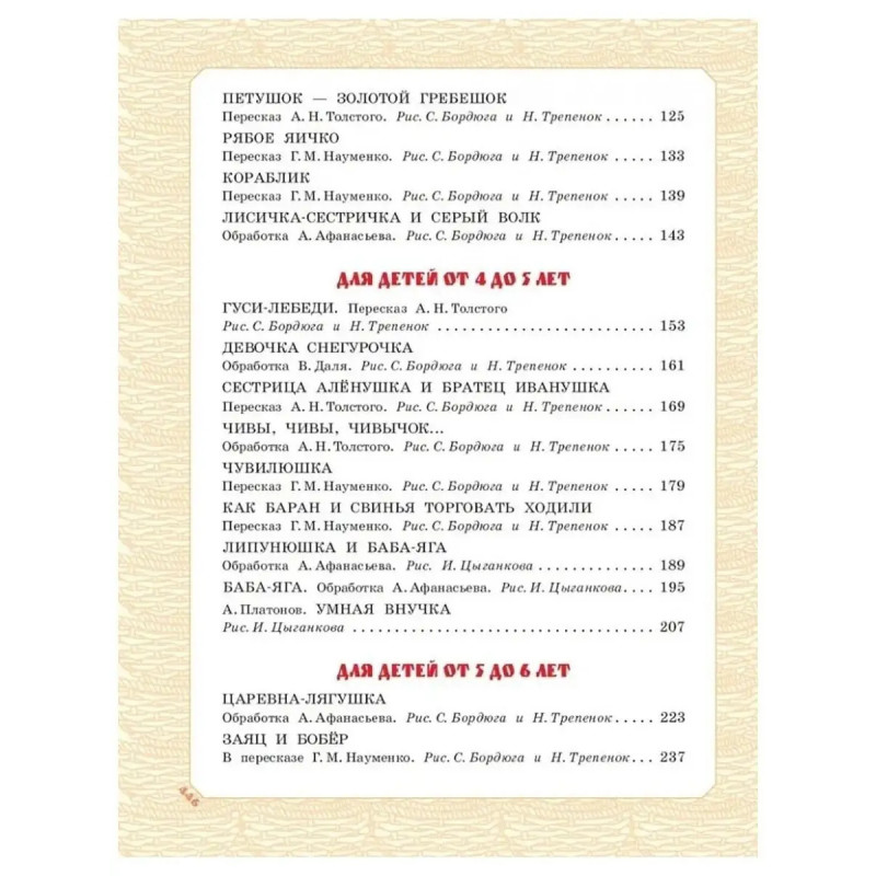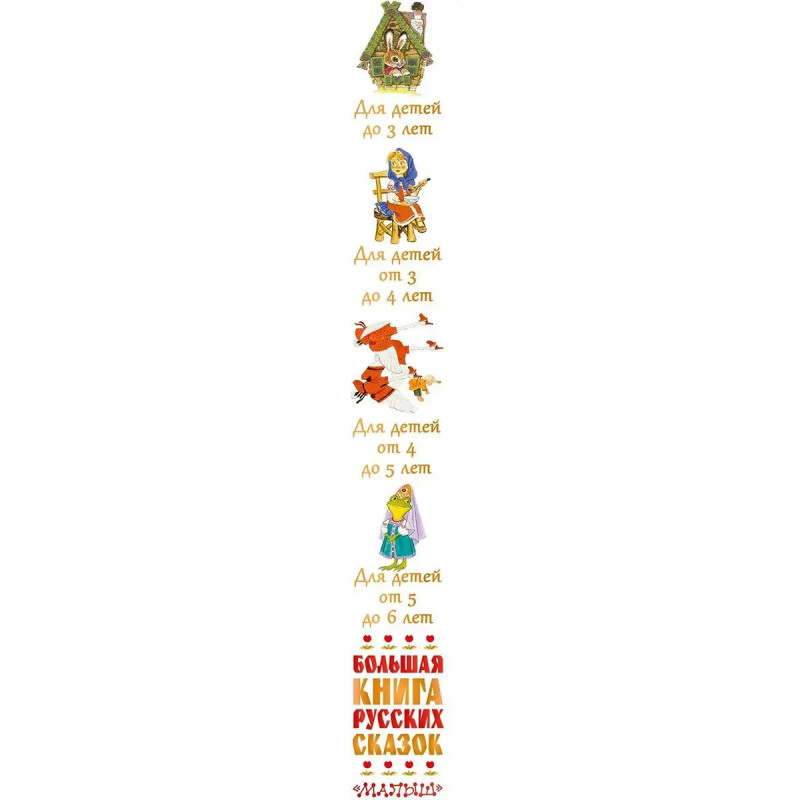 Большая книга русских сказок. В Большой книге русских сказок собраны самые знаменитые русские сказки в классических обработках А. Н. Афанасьева, К. Д. Ушинского, А. Н. Толстого, В. П. Аникина и других знатоков русских традиций и быта. Слушая сказки, малыш учиться сопереживать, различать добро и зло, ценить справедливость и дружбу. В этом сборнике сказки разделены по возрастам для лучшего восприятия услышанного, а потом уже и прочитанного: для детей до 3 лет, для детей 3-4 лет, для детей 4-5 лет и для детей 5-6 лет. Большие, яркие, подробные иллюстрации помогут юным читателям погрузиться в мир русских сказок и подружиться с их героями. Эта книга одно из самых полных собраний русских сказок для детей с рождения и до школы. Для дошкольного возраста.
