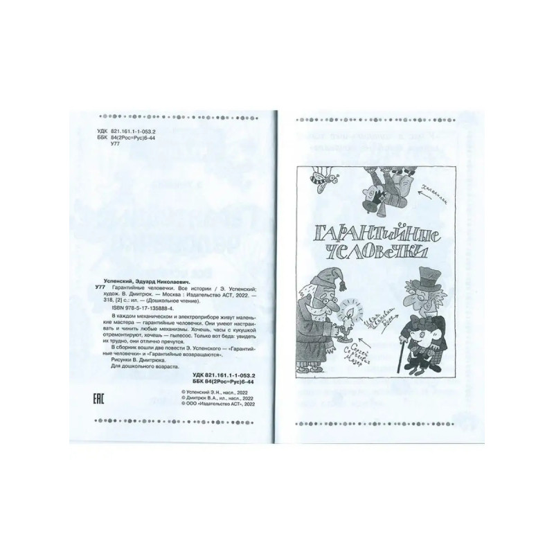 Гарантийные человечки. Все истории. В каждом механическом и электроприборе живут маленькие мастера гарантийные человечки. Они умеют настраивать и чинить любые механизмы. Хочешь, часы с кукушкой отремонтируют, хочешь пылесос. Только вот беда: увидеть их трудно, они отлично прячутся. В сборник вошли две повести Э. Успенского "Гарантийные человечки" и "Гарантийные возвращаются". Рисунки В. Дмитрюка. Для дошкольного возраста.