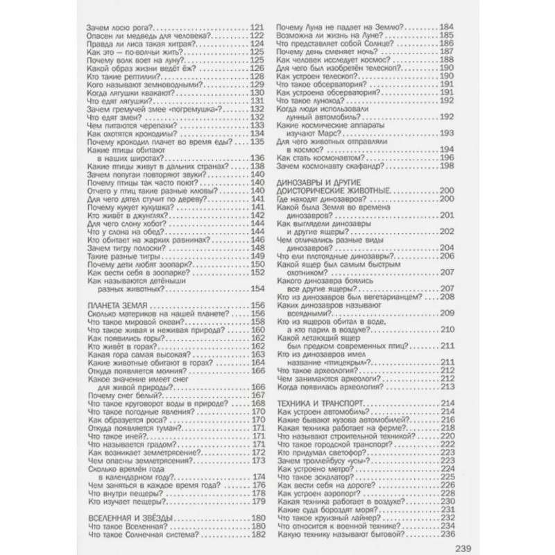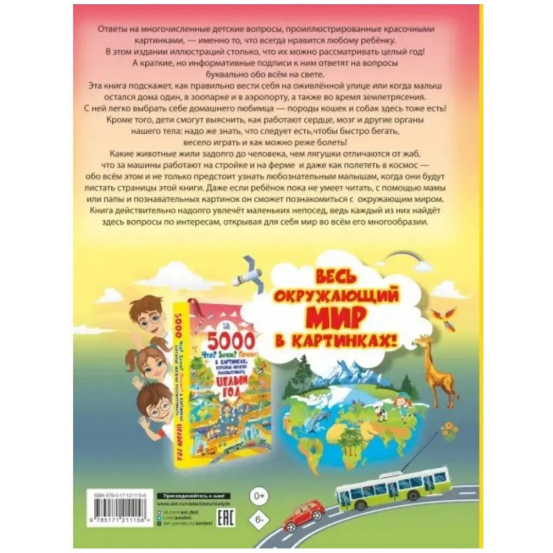 ISBN 9785-17121-1158. 5000 "что, зачем, почему" в картинках, которые можно рассматривать целый год. Разве можно представить большее удовольствие для ребёнка, чем рассматривать тысячи картинок? Да ещё получая ответы на свои многочисленные вопросы обо всём на свете! Это уникальное издание - "5000 Что? Зачем? Почему? в картинках, которые можно рассматривать целый год" - увлечёт любознательного малыша действительно надолго и поможет ему составить всестороннее представление об окружающем его мире. Ведь чего только нет на страницах книги! Человек и его строение, планета Земля и полёты в космос, породы домашних любимцев - кошек и собак - и повадки диких зверей, динозавры и другие древние животные, устройство аэропорта и автомастерской, различные виды транспорта, правила поведения дома и на улице, здоровый образ жизни и полезные развлечения... Список тем можно продолжать так же долго, как и рассматривать 5000 картинок данной энциклопедии.