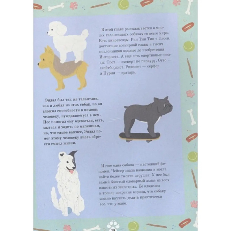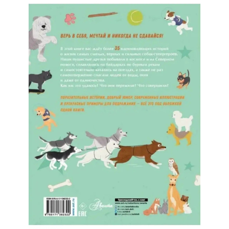 ISBN 9785-17138-2322. Собаки-супергерои. Рич П., Муньос И. С тех пор как человек приручил волка, прошло по меньшей мере 15 000 лет, и до сих пор собака является лучшим другом человека. Книга "Собаки-супергерои" расскажет вам о жизни более чем 35 собак. Некоторые из них были кинозвездами, а другие были спасателями, путешественниками, военными, космонавтами, собаками-терапевтами и поводырями. Истории, которые собраны в этой книге, рассказывают о совершенно разных собаках, но их имена запомнились людям благодаря их храбрости, верности, доброте, энергии и силе. Для среднего школьного возраста. Верь в себя, мечтай и никогда не сдавайся!В этой книге вас ждёт более 35 вдохновляющих историй о жизни самых смелых, верных и сильных собак-супергероев. Наши пушистые друзья побывали в космосе и на Северном полюсе, сплавлялись на байдарках по бурным рекам и самостоятельно катались на поездах, а также не раз самоотверженно спасали людей от воды, огня и даже от одиночества.