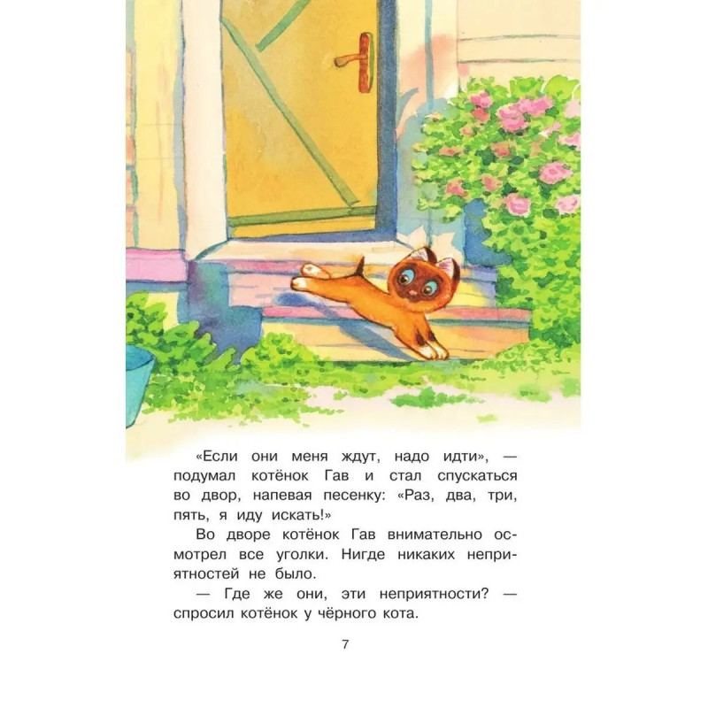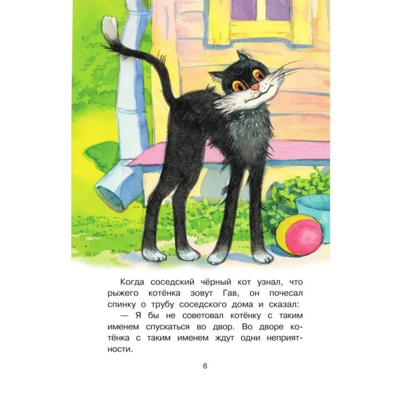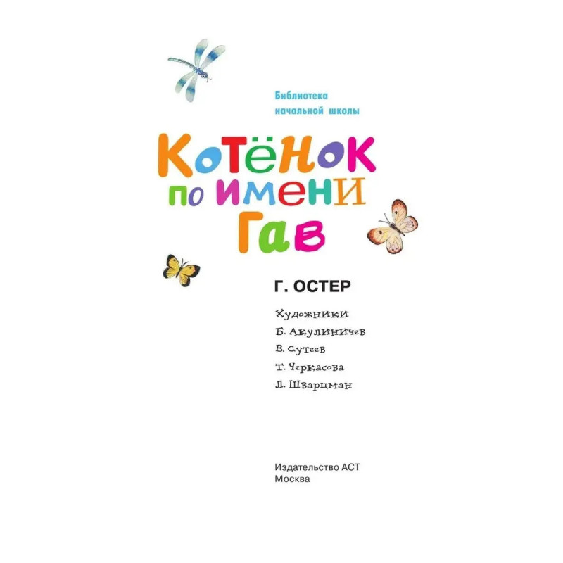 ISBN 9785-17117-2244. Котенок по имени Гав. В книгу Григория Остера "Котёнок по имени Гав" вошли все истории о приключениях любознательного котёнка с необычным именем и его друга щенка Шарика. Гав постоянно попадает в нелепые ситуации и находит приключения сразу, как только выходит из дома. Он не боится неприятностей, знает, где середина у сосиски, может объяснить для чего нужен cекретный язык и почему бояться грозы веселей вместе с другом. Сказочные истории повествуют о настоящей дружбе и учат проявлять заботу по отношению к окружающим. Художники Б. Акулиничев, В. Сутеев, Т. Черкасова, Л. Шварцман. Для младшего школьного возраста.