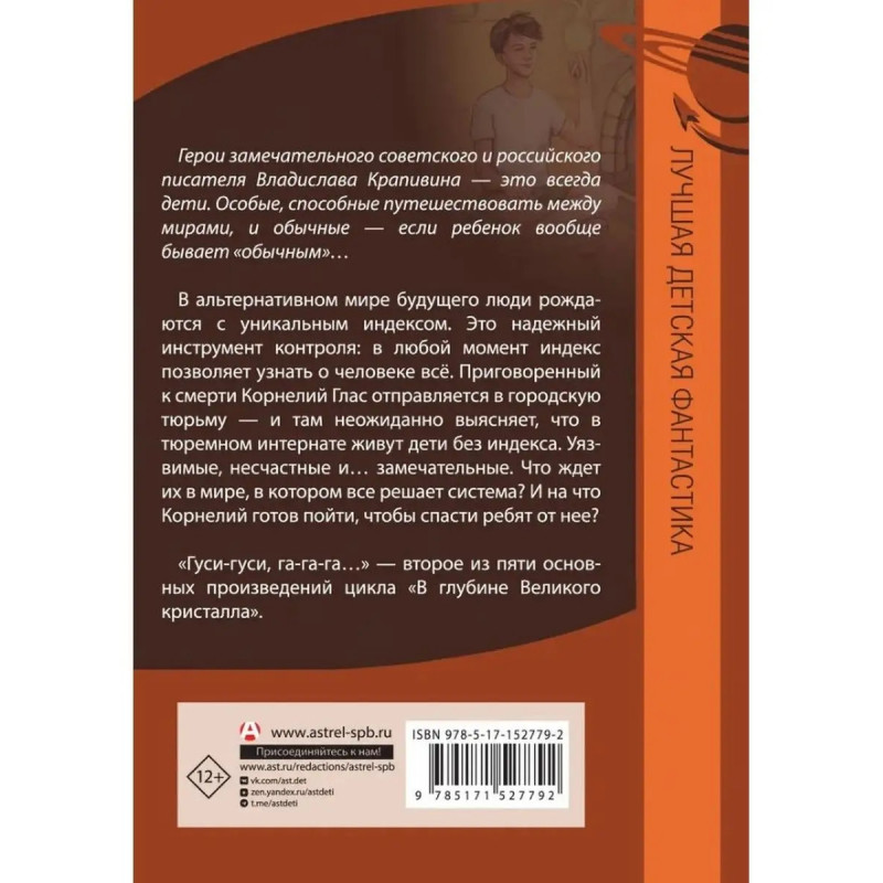 ISBN 9785-17152-7792. Великий Кристалл 2. Гуси-гуси, га-га-га... . Крапивин В. П. В альтернативном мире будущего люди рождаются с уникальным индексом. Это надежный инструмент контроля: в любой момент индекс позволяет узнать о человеке всё. Приговоренный к смерти Корнелий Глас отправляется в городскую тюрьму и там неожиданно выясняет, что в тюремном интернате живут дети без индекса. Уязвимые, несчастные и замечательные. Что ждет их в мире, в котором все решает система? И на что Корнелий готов пойти, чтобы спасти ребят от нее?"Гуси-гуси, га-га-га" второе из пяти основных произведений цикла "В глубине Великого кристалла".