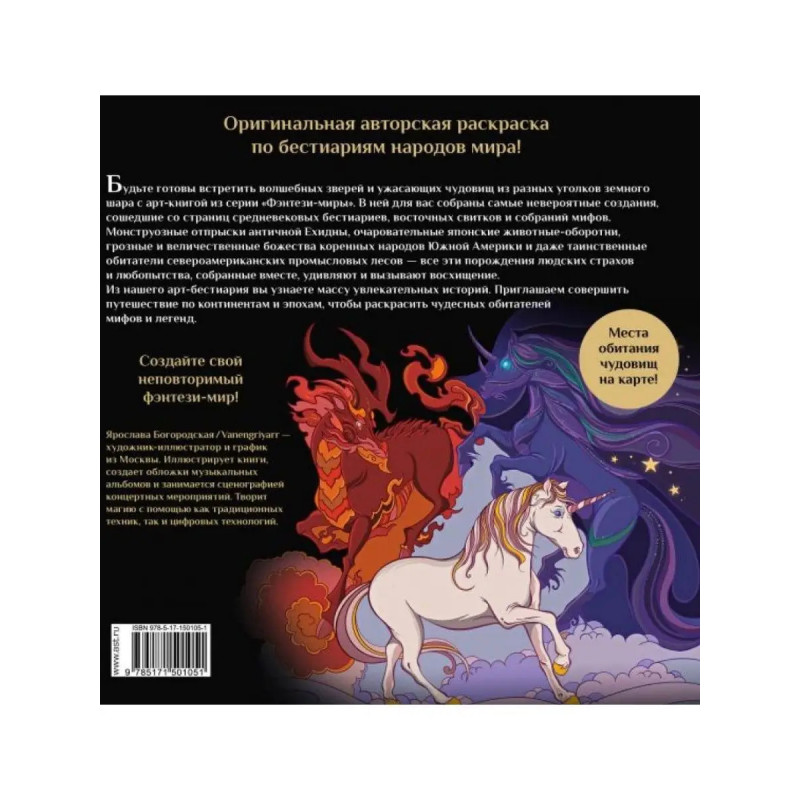 Химеры, василиски и другие монстры мировых бестиариев. Богородская Я. И. Оригинальная авторская раскраска по бестиариям народов мира!Будьте готовы встретить волшебных зверей и ужасающих чудовищ из разных уголков земного шара с арт-книгой из серии "Фэнтези-миры". В ней для вас собраны самые невероятные создания, сошедшие со страниц средневековых бестиариев, восточных свитков и собраний мифов. Монструозные отпрыски античной Ехидны, очаровательные японские животные-оборотни, грозные и величественные божества коренных народов Южной Америки и даже таинственные обитатели североамериканских промысловых лесов все эти порождения людских страхов и любопытства, собранные вместе, удивляют и вызывают восхищение. Из нашего арт-бестиария вы узнаете массу увлекательных историй. Приглашаем совершить путешествие по континентам и эпохам, чтобы раскрасить чудесных обитателей мифов и легенд. Создайте свой неповторимый фэнтези-мир!- 12 цветных полос содержат авторские иллюстрации и увлекательные факты о мифических существах со всего мира.- Изображения для раскрашивания полосные и разворотные иллюстрации высокой детализации дополнены информацией о каждом фантастическом создании.- Увеличенный формат предоставляет пространство для творчества.- Сверхплотная офсетная бумага подходит для любых художественных материалов от цветных карандашей и маркеров до акварельных и гуашевых красок. Без просвечивания и отмарывания. Ярослава Богородская / Vanengriyarr художник-иллюстратор и график из Москвы. Иллюстрирует книги, создает обложки музыкальных альбомов и занимается сценографией концертных мероприятий. Творит магию с помощью как традиционных техник, так и цифровых технологий.