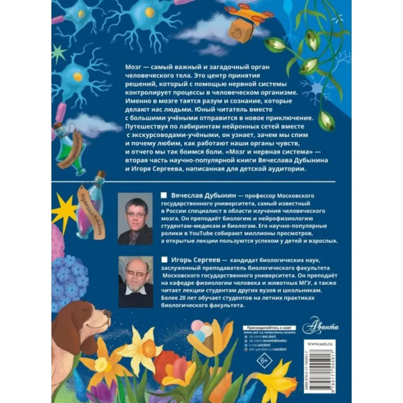 Мозг и нервная система. Дубынин В. А., Сергеев И. Ю. Путешествуя по разнообразным системам человеческого организма, невольно задаёшься вопросом: "Кто же управляет всеми этими сложными структурами?" Казалось бы, ответ лежит на поверхности, это мозг, самый сложноустроенный орган нашего тела. В действительности, мозг контролирует организм при помощи нервной системы, которая оплетает всё тело своими узлами. Выдающиеся учёные Вячеслав Дубынин и Игорь Сергеев предлагают юному читателю отправиться в захватывающее путешествие по нейронным сетям и отделам мозга, чтобы изучить принципы работы важнейших систем нашего организма. В очередной раз два суперизвестных учёных расскажут детям о большой науке.
