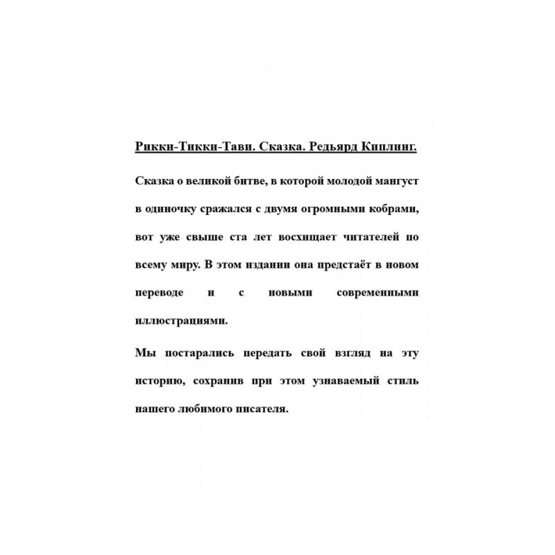 Рикки-Тикки-Тави. Сказка. Редьярд Киплинг. Сказка о великой битве, в которой молодой мангуст в одиночку сражался с двумя огромными кобрами, вот уже свыше ста лет восхищает читателей по всему миру. В этом издании она предстаёт в новом переводе и с новыми современными иллюстрациями.Мы постарались передать свой взгляд на эту историю, сохранив при этом узнаваемый стиль нашего любимого писателя.Свернуть