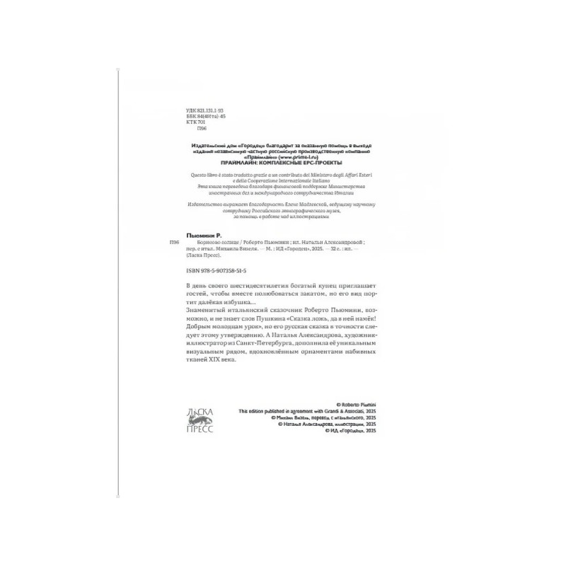 В день своего шестидесятилетия богатый купец приглашает гостей, чтобы вместе полюбоваться закатом, но его вид портит далёкая избушкаЗнаменитый итальянский сказочник Роберто Пьюмини, возможно, и не знает слов Пушкина "Сказка ложь, да в ней намёк! Добрым молодцам урок", но его русская сказка в точности следует этому утверждению. А Наталья Александрова, художник-иллюстратор из Санкт-Петербурга, дополнила её уникальным визуальным рядом, вдохновлённым орнаментами набивных тканей XIX века.