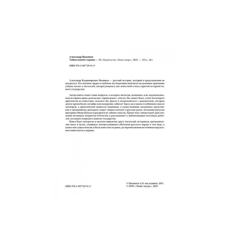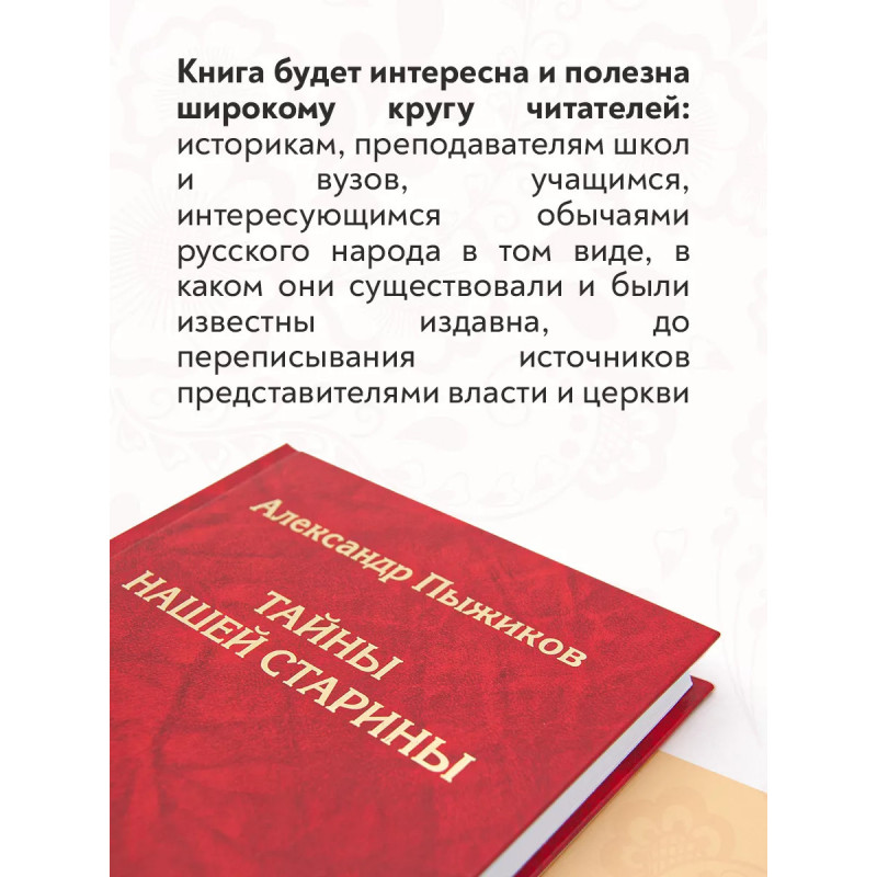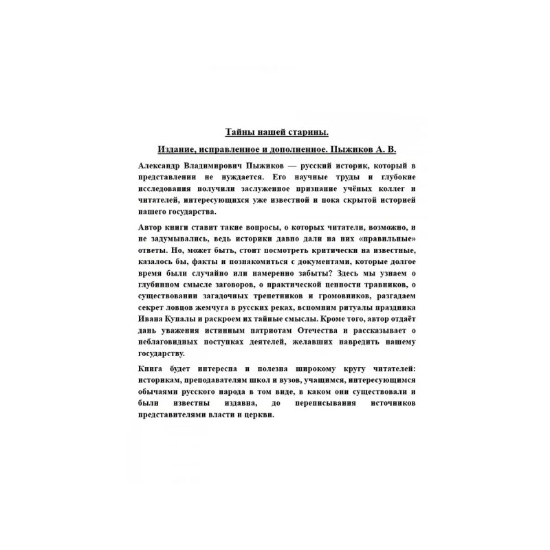 Тайны нашей старины. Издание исправленное и дополненное. Пыжиков А.В. Александр Владимирович Пыжиков русский историк, который в представлении не нуждается. Его научные труды и глубокие исследования получили заслуженное признание учёных коллег и читателей, интересующихся уже известной и пока скрытой историей нашего государства.Автор книги ставит такие вопросы, о которых читатели, возможно, и не задумывались, ведь историки давно дали на них "правильные" ответы. Но, может быть, стоит посмотреть критически на известные, казалось бы, факты и познакомиться с документами, которые долгое время были случайно или намеренно забыты? Здесь мы узнаем о глубинном смысле заговоров, о практической ценности травников, о существовании загадочных трепетников и громовников, разгадаем секрет ловцов жемчуга в русских реках, вспомним ритуалы праздника Ивана Купалы и раскроем их тайные смыслы. Кроме того, автор отдаёт дань уважения истинным патриотам Отечества и рассказывает о неблаговидных поступках деятелей, желавших навредить нашему государству.Книга будет интересна и полезна широкому кругу читателей: историкам, преподавателям школ и вузов, учащимся, интересующимся обычаями русского народа в том виде, в каком они существовали и были известны издавна, до переписывания источников представителями власти и церкви.