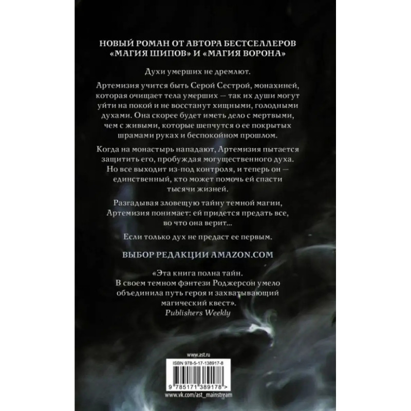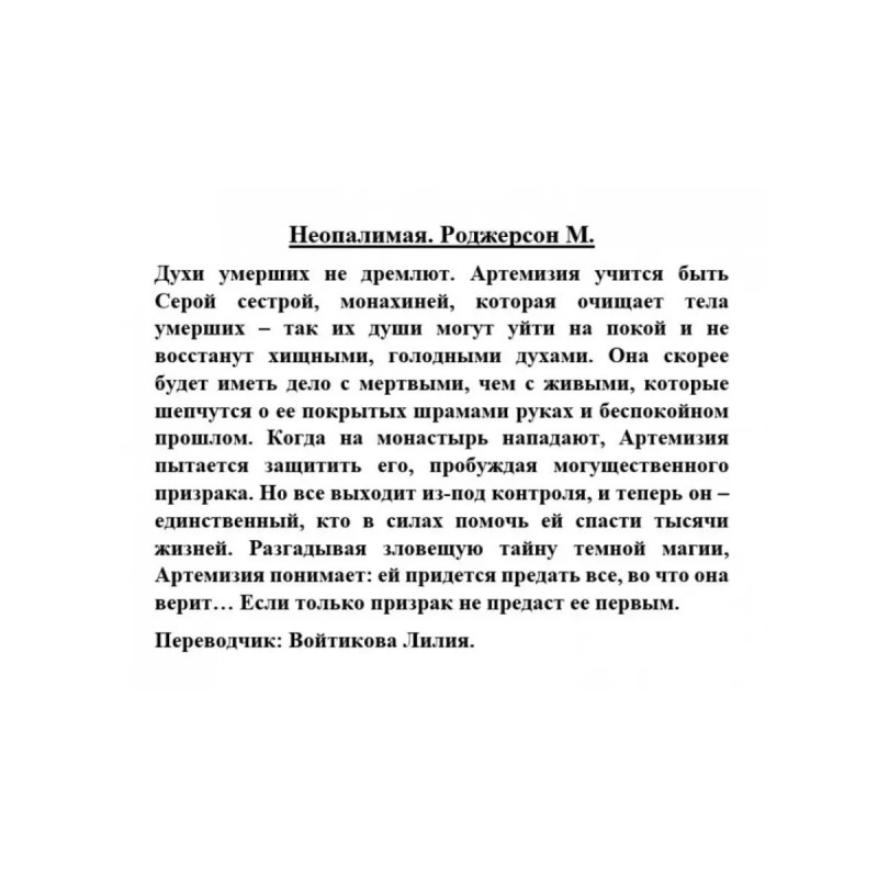 ISBN 9785-17138-9178. Неопалимая. Роджерсон М. Неопалимая. Роджерсон М. Духи умерших не дремлют. Артемизия учится быть Серой сестрой, монахиней, которая очищает тела умерших так их души могут уйти на покой и не восстанут хищными, голодными духами. Она скорее будет иметь дело с мертвыми, чем с живыми, которые шепчутся о ее покрытых шрамами руках и беспокойном прошлом. Когда на монастырь нападают, Артемизия пытается защитить его, пробуждая могущественного призрака. Но все выходит из-под контроля, и теперь он единственный, кто в силах помочь ей спасти тысячи жизней. Разгадывая зловещую тайну темной магии, Артемизия понимает: ей придется предать все, во что она верит Если только призрак не предаст ее первым.