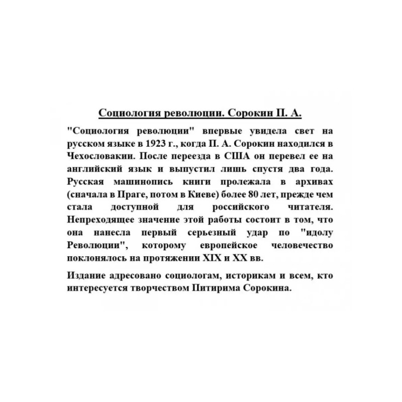 ISBN 9785-82913-9698. Социология революции. Социология революции. Сорокин П. А. "Социология революции" впервые увидела свет на русском языке в 1923 г., когда П. А. Сорокин находился в Чехословакии. После переезда в США он перевел ее на английский язык и выпустил лишь спустя два года. Русская машинопись книги пролежала в архивах (сначала в Праге, потом в Киеве) более 80 лет, прежде чем стала доступной для российского читателя. Непреходящее значение этой работы состоит в том, что она нанесла первый серьезный удар по "идолу Революции", которому европейское человечество поклонялось на протяжении XIX и XX вв. Издание адресовано социологам, историкам и всем, кто интересуется творчеством Питирима Сорокина.