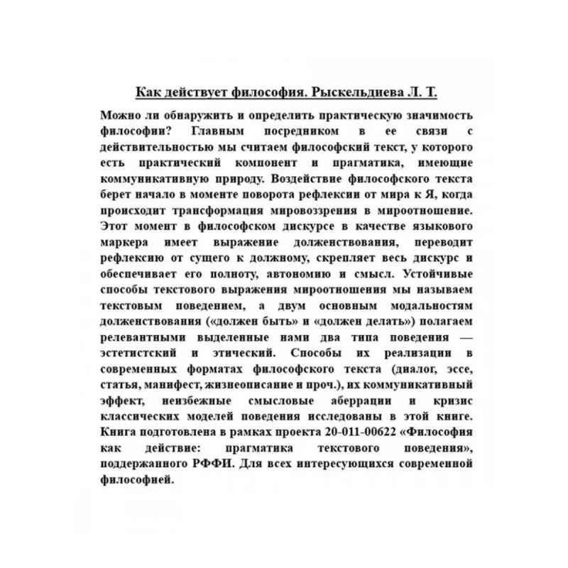 Как действует философия. Рыскельдиева Л. Т. Можно ли обнаружить и определить практическую значимость философии? Главным посредником в ее связи с действительностью мы считаем философский текст, у которого есть практический компонент и прагматика, имеющие коммуникативную природу. Воздействие философского текста берет начало в моменте поворота рефлексии от мира к Я, когда происходит трансформация мировоззрения в мироотношение. Этот момент в философском дискурсе в качестве языкового маркера имеет выражение долженствования, переводит рефлексию от сущего к должному, скрепляет весь дискурс и обеспечивает его полноту, автономию и смысл. Устойчивые способы текстового выражения мироотношения мы называем текстовым поведением, а двум основным модальностям долженствования ("должен быть" и "должен делать") полагаем релевантными выделенные нами два типа поведения эстетистский и этический. Способы их реализации в современных форматах философского текста (диалог, эссе, статья, манифест, жизнеописание и проч.), их коммуникативный эффект, неизбежные смысловые аберрации и кризис классических моделей поведения исследованы в этой книге. Книга подготовлена в рамках проекта 20-011-00622 "Философия как действие: прагматика текстового поведения", поддержанного РФФИ. Для всех интересующихся современной философией.