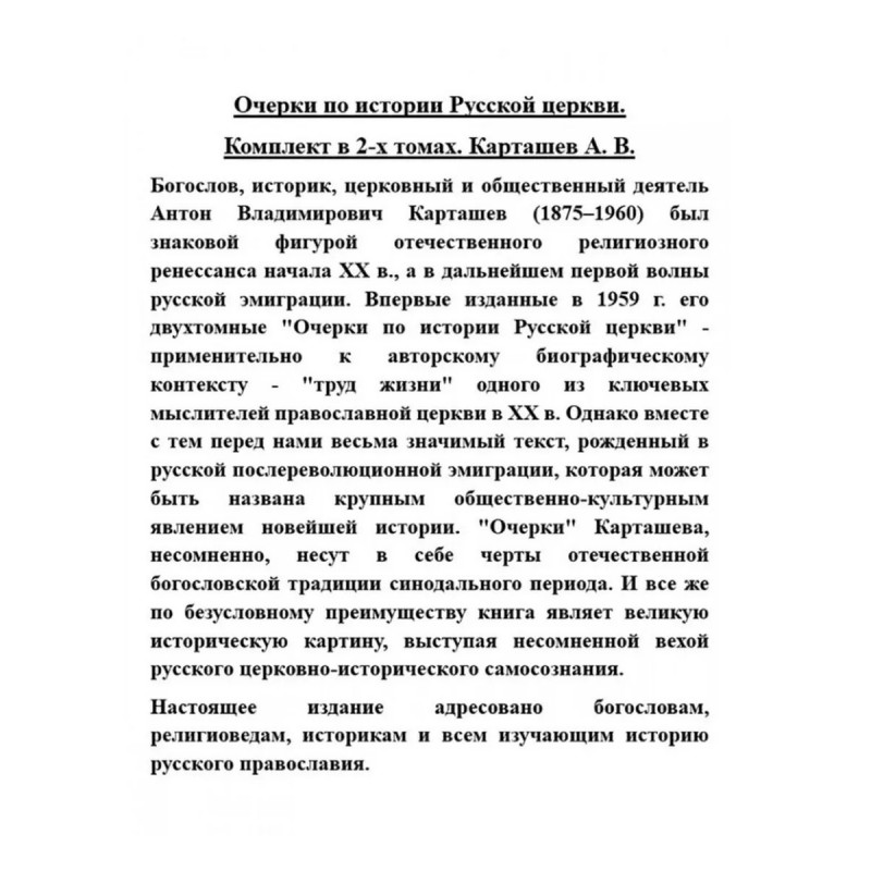 Очерки по истории Русской церкви. Комплект в 2-х томах. Карташев А. В. Богослов, историк, церковный и общественный деятель Антон Владимирович Карташев (1875-1960) был знаковой фигурой отечественного религиозного ренессанса начала ХХ в., а в дальнейшем первой волны русской эмиграции. Впервые изданные в 1959 г. его двухтомные "Очерки по истории Русской церкви" - применительно к авторскому биографическому контексту - "труд жизни" одного из ключевых мыслителей православной церкви в XX в. Однако вместе с тем перед нами весьма значимый текст, рожденный в русской послереволюционной эмиграции, которая может быть названа крупным общественно-культурным явлением новейшей истории. "Очерки" Карташева, несомненно, несут в себе черты отечественной богословской традиции синодального периода. И все же по безусловному преимуществу книга являет великую историческую картину, выступая несомненной вехой русского церковно-исторического самосознания. Настоящее издание адресовано богословам, религиоведам, историкам и всем изучающим историю русского православия.