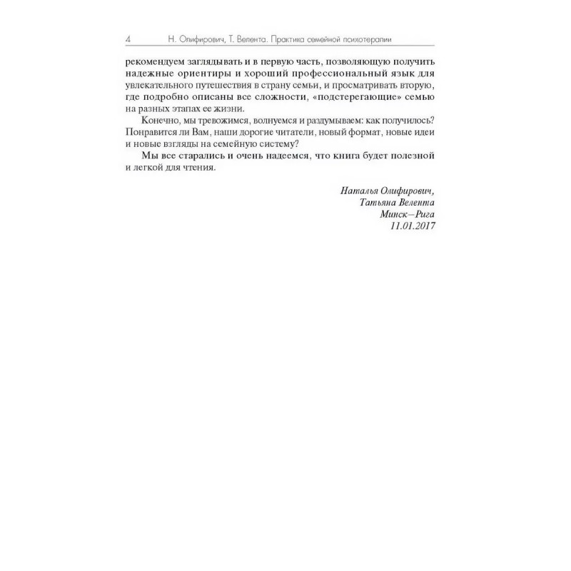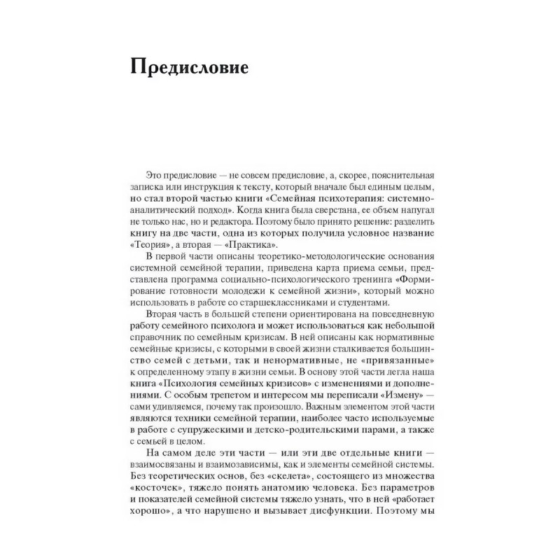 Практика семейной психотерапии: системно-аналитический подход. Олифирович Н., Велента Т. В книге приводится детальная информация о нормативных и ненормативных семейных кризисах, к числу которых относятся измена, инцест, развод. Систематизированы и подробно охарактеризованы базовые техники работы с семейной системой. Книга написана ясным языком, иллюстрирована многочисленными примерами из терапевтической практики авторов. Издание будет полезно студентам и специалистам в области работы с семьей: психологам, психотерапевтам, социальным педагогам, социальным работникам, а также всем тем, кому интересны актуальные проблемы и перспективы оказания помощи семейным системам.