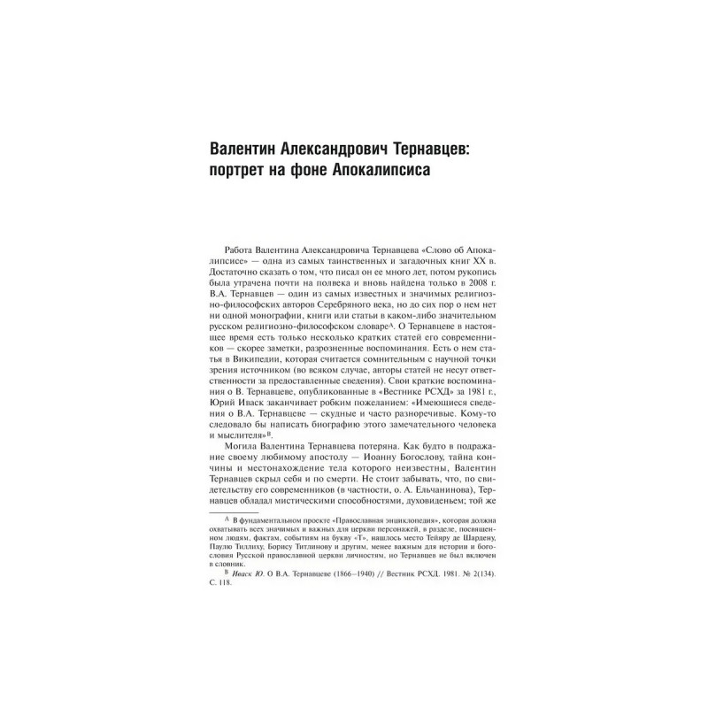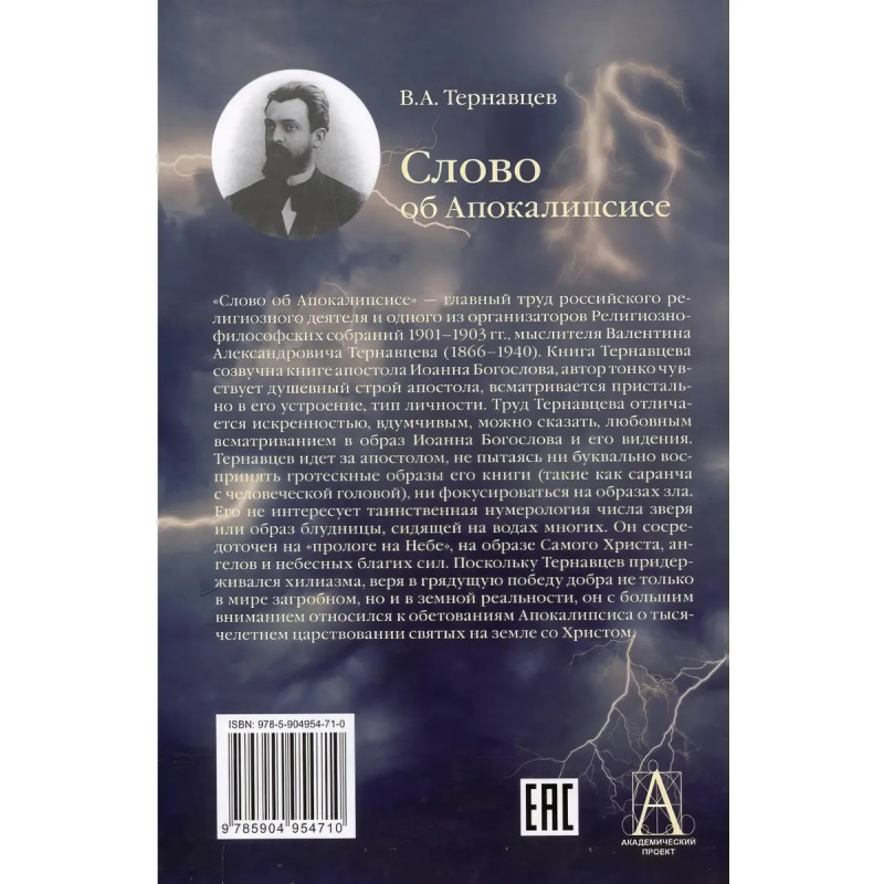Слово об Апокалипсисе главный труд российского религиозного деятеля и одного из организаторов Религиозно-философских собраний 19011903 гг., мыслителя Валентина Александровича Тернавцева (18661940). Книга Тернавцева созвучна книге апостола Иоанна Богослова, автор тонко чувствует душевный строй апостола, всматривается пристально в его устроение, тип личности. Труд Тернавцева отличается искренностью, вдумчивым, можно сказать, любовным всматриванием в образ Иоанна Богослова и его видения. Тернавцев идет за апостолом, не пытаясь ни буквально воспринять гротескные образы его книги (такие как саранча с человеческой головой), ни фокусироваться на образах зла. Его не интересует таинственная нумерология числа зверя или образ блудницы, сидящей на водах многих. Он сосредоточен на прологе на Небе, на образе Самого Христа, ангелов и небесных благих сил. Поскольку Тернавцев придерживался хилиазма, веря в грядущую победу добра не только в мире загробном, но и в земной реальности, он с большим вниманием относился к обетованиям Апокалипсиса о тысячелетнем царствовании святых на земле со Христом. Книга издается впервые и адресована философам, богословам и заинтересованным эрудированным читателям.