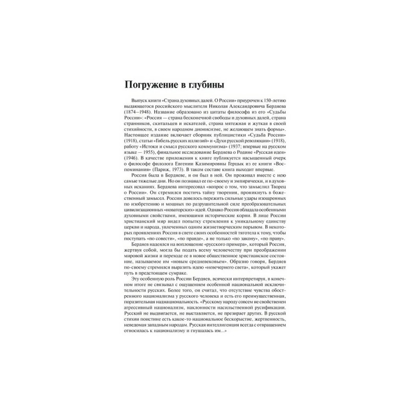 Книга крупнейшего русского философа Н. А. Бердяева (18741948) Страна духовных далей. О России приурочена к его 150-летию. Ее название образовано из цитаты Бердяева. Книга составлена из фундаментальных трудов мыслителя: сборника публицистики Судьба России (1918), статей Гибель русских иллюзий и Духи русской революции (1918), работы Истоки и смысл русского коммунизма (1937), итоговых размышлений об Отечестве Русская идея (1946). В качестве приложения приводятся содержательные воспоминания о Бердяеве переводчика, критика и мемуариста Е. К. Герцык (18781944). Издание, позволяя получить представление о развитии взглядов философа на протяжении его пути, имеет непреходящее общественно-историческое значение и адресовано специалистам гуманитарной направленности, а также широкому кругу читателей.