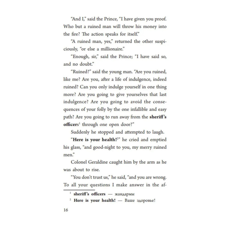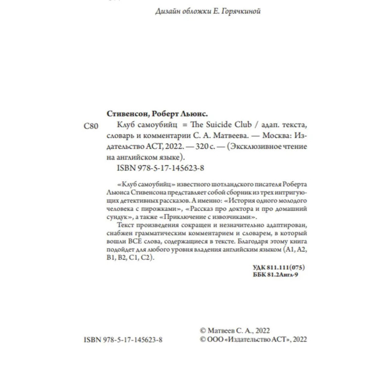 ISBN 9785-1714-56238. Клуб самоубийц. "Клуб самоубийц" известного шотландского писателя Роберта Льюиса Стивенсона представляет собой сборник из трех интригующих детективных рассказов. А именно: "История одного молодого человека с пирожками", "Рассказ про доктора и про домашний сундук", а также "Приключение с извозчиками". Текст произведения сокращен и незначительно адаптирован, снабжен грамматическим комментарием и словарем, в который вошли ВСЕ слова, содержащиеся в тексте. Благодаря этому книга подойдет для любого уровня владения английским языком (А1, А2, В1, В2, С1, С2).