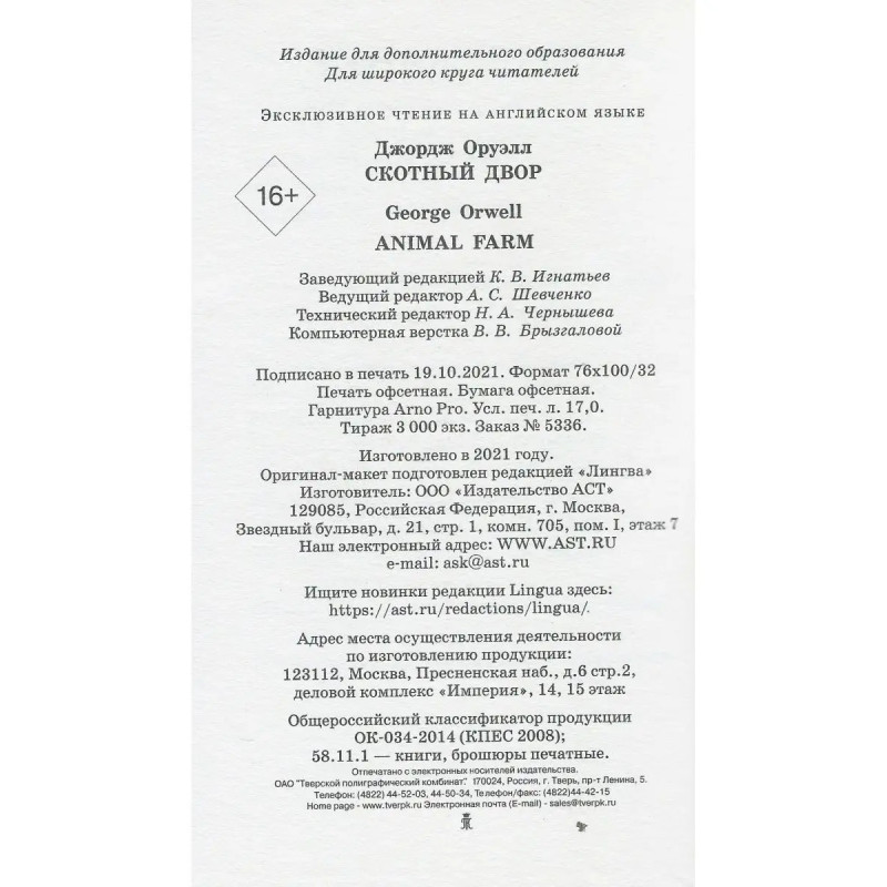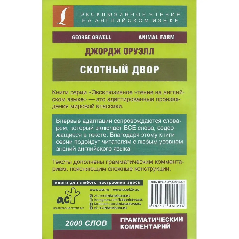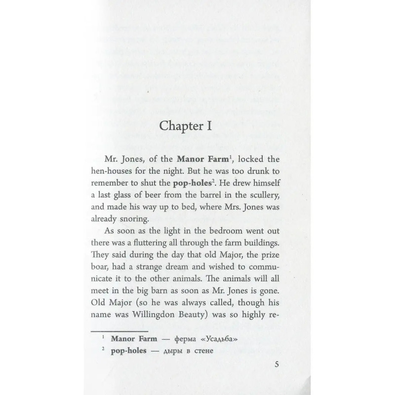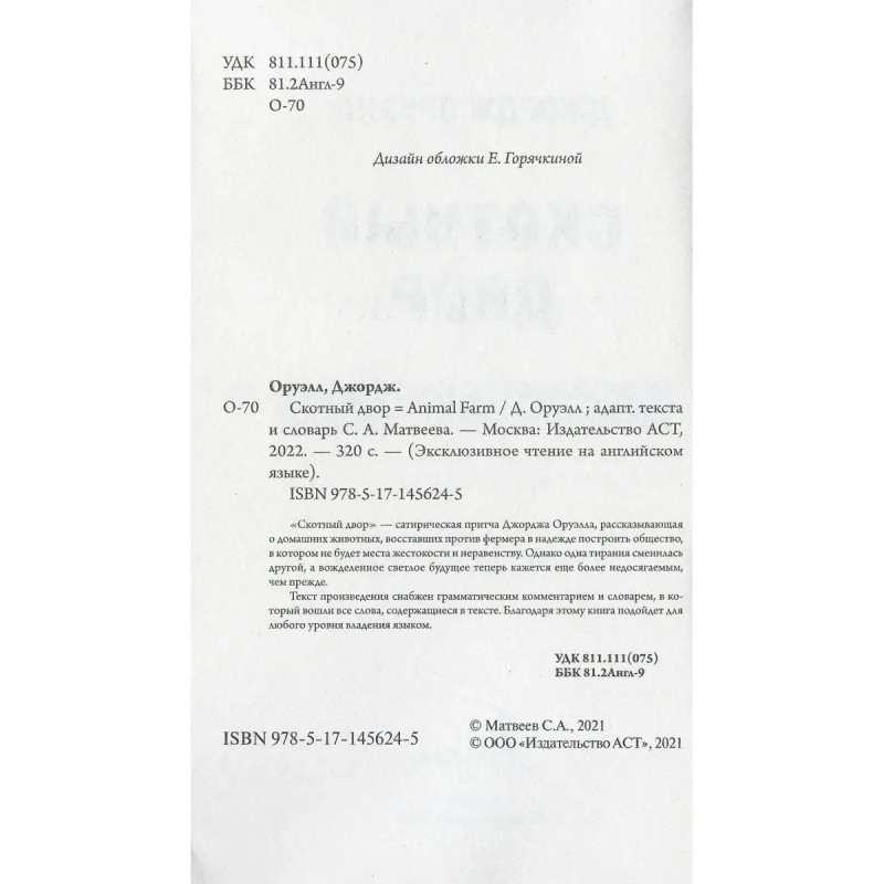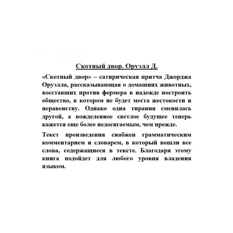 "Скотный двор" сатирическая притча Джорджа Оруэлла, рассказывающая о домашних животных, восставших против фермера в надежде построить общество, в котором не будет места жестокости и неравенству. Однако одна тирания сменилась другой, а вожделенное светлое будущее теперь кажется еще более недосягаемым, чем прежде. Текст произведения снабжен грамматическим комментарием и словарем, в который вошли все слова, содержащиеся в тексте. Благодаря этому книга подойдет для любого уровня владения языком.
