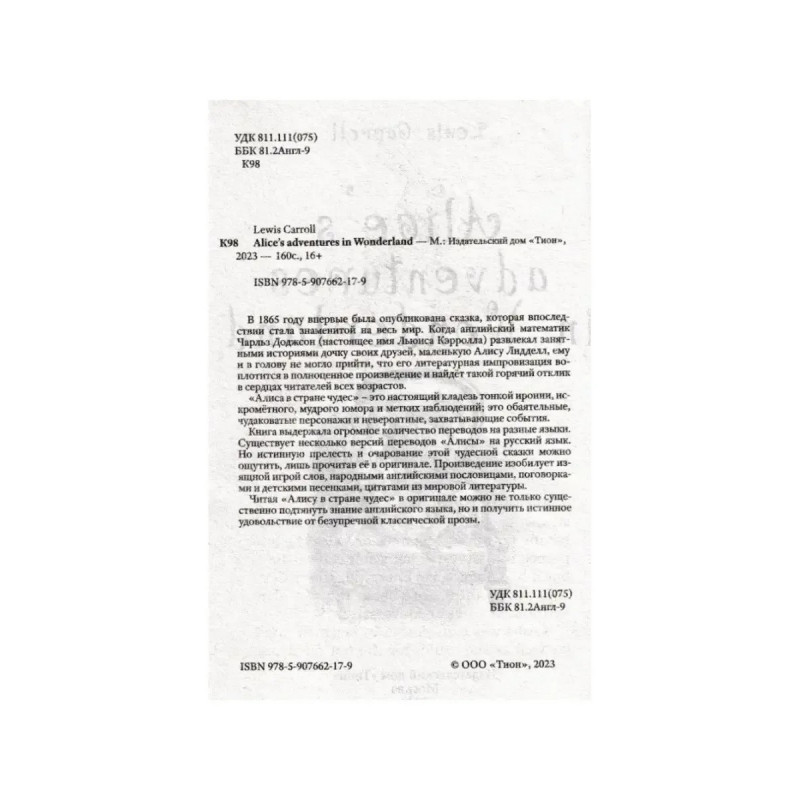 Характеристики Алиса в стране чудес Alice’s adventures in Wonderland