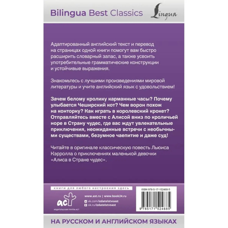 ISBN 9785-17152-4685. Алиса в Стране чудес Alice's Adventures in Wonderland (на русском и английском языках). Зачем белому кролику карманные часы? Почему улыбается Чеширский кот? Чем ворон похож на конторку? Как играть в королевский крокет? Отправляйтесь вместе с Алисой вниз по кроличьей норе в Страну чудес, где вас ждут увлекательные приключения, неожиданные встречи с необычными существами, безумное чаепитие и даже суд! Читайте в оригинале классическую повесть Льюиса Кэрролла о приключениях маленькой девочки "Алиса в Стране чудес". Адаптированный английский текст и перевод на страницах одной книги помогут легко познакомиться с лучшими произведениями мировой литературы и выучить английский язык с удовольствием. Благодаря параллельным текстам вы быстро расширите свой словарный запас, а также усвоите употребительные грамматические конструкции и устойчивые выражения. Издание адресовано всем, кто хочет совершенствовать свои знания и читать литературу на языке оригинала.