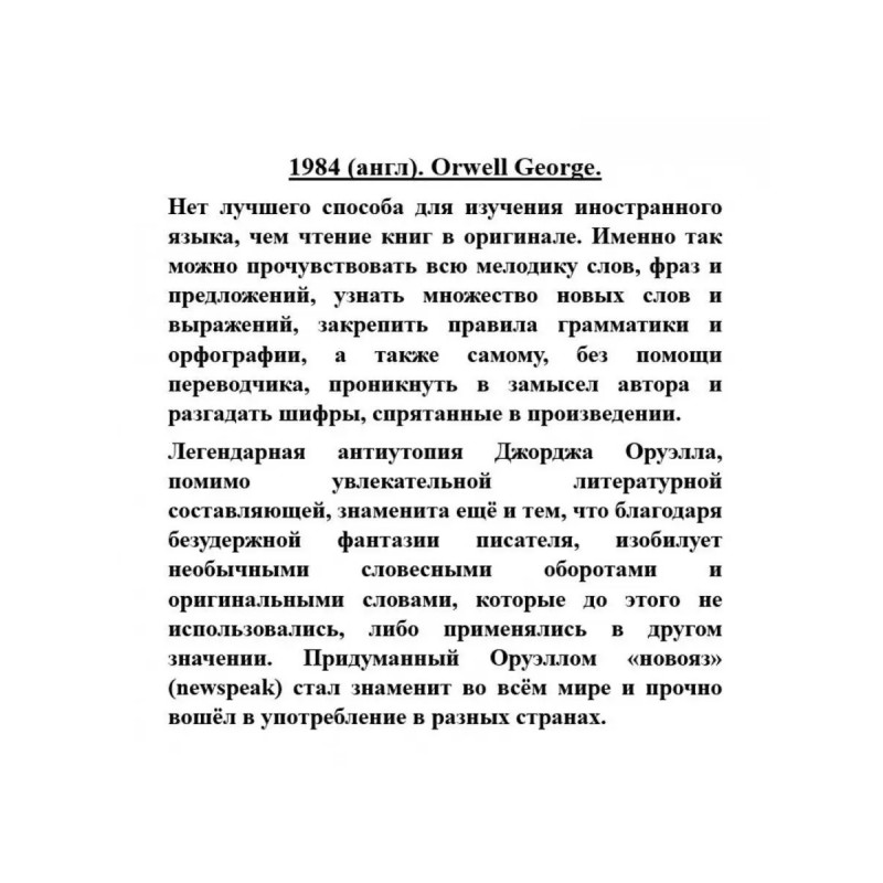 1984 (англ). Orwell George. 1984 (англ). Orwell George.Нет лучшего способа для изучения иностранного языка, чем чтение книг в оригинале. Именно так можно прочувствовать всю мелодику слов, фраз и предложений, узнать множество новых слов и выражений, закрепить правила грамматики и орфографии, а также самому, без помощи переводчика, проникнуть в замысел автора и разгадать шифры, спрятанные в произведении.Легендарная антиутопия Джорджа Оруэлла, помимо увлекательной литературной составляющей, знаменита ещё и тем, что благодаря безудержной фантазии писателя, изобилует необычными словесными оборотами и оригинальными словами, которые до этого не использовались, либо применялись в другом значении. Придуманный Оруэллом "новояз" (newspeak) стал знаменит во всём мире и прочно вошёл в употребление в разных странах.